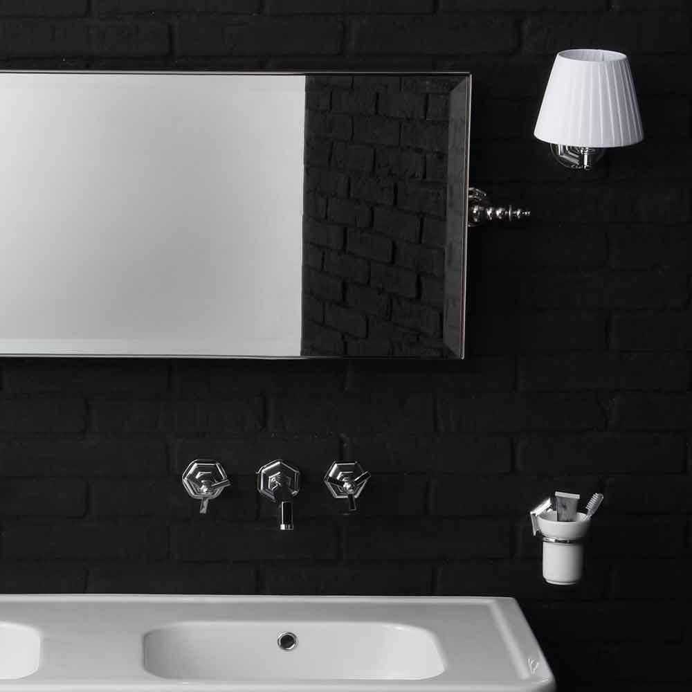 Aby nadać całej kompozycji odrobinę światła, zawiera krany, syfony i odpływy w chromowanym wykończeniu, a także piękne i przestronne prostokątne uchylne lustro z chromowaną mosiężną ramą.