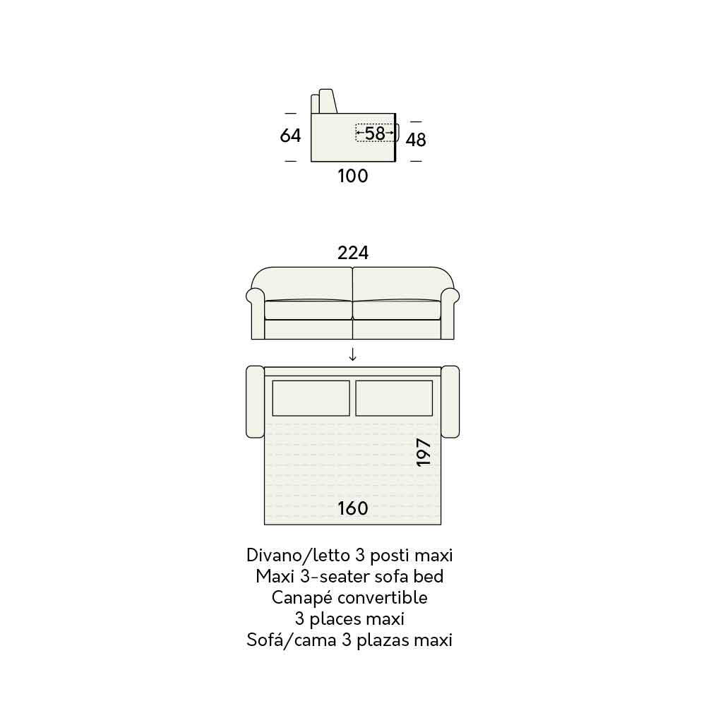 - Dł. 224 x gł. 100 x wys. 93 cm (materac: dł. 160 x gł. 197 x wys. 14 cm).