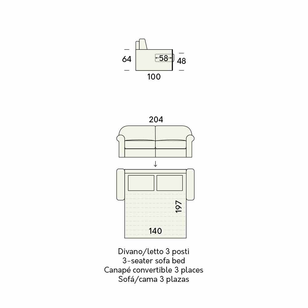 - Dł. 204 x gł. 100 x wys. 93 cm (materac: dł. 140 x gł. 197 x wys. 14 cm);