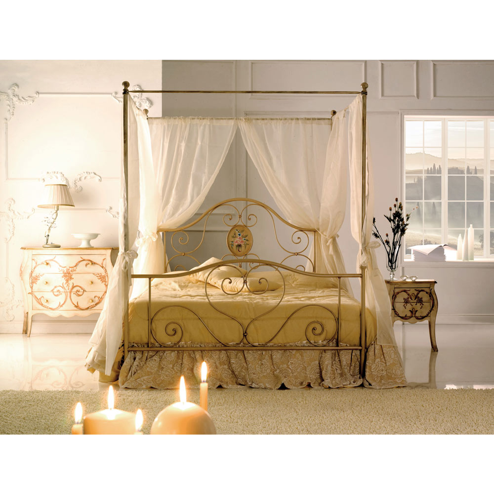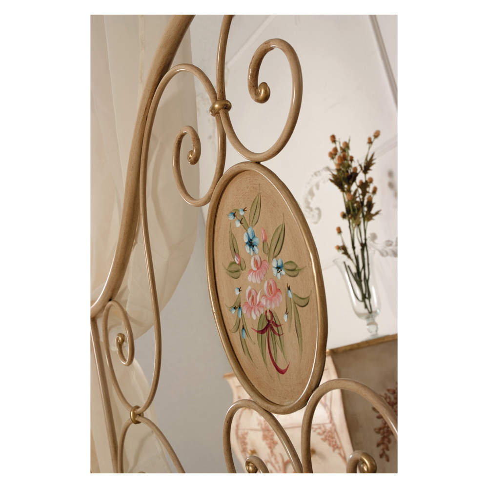 rur żelaznych wykończonych proszkowo w kolorze antycznej kości słoniowej. To łóżko to wybór charakteru o zdecydowanie klasycznym smaku, który zawiera niezrównaną miękkość i wyrafinowanie. Kwiatowy detal na zagłówku został wykonany ręcznie z dużą starannością i uwagą, aby nadać produktowi niepowtarzalny i niepowtarzalny charakter.