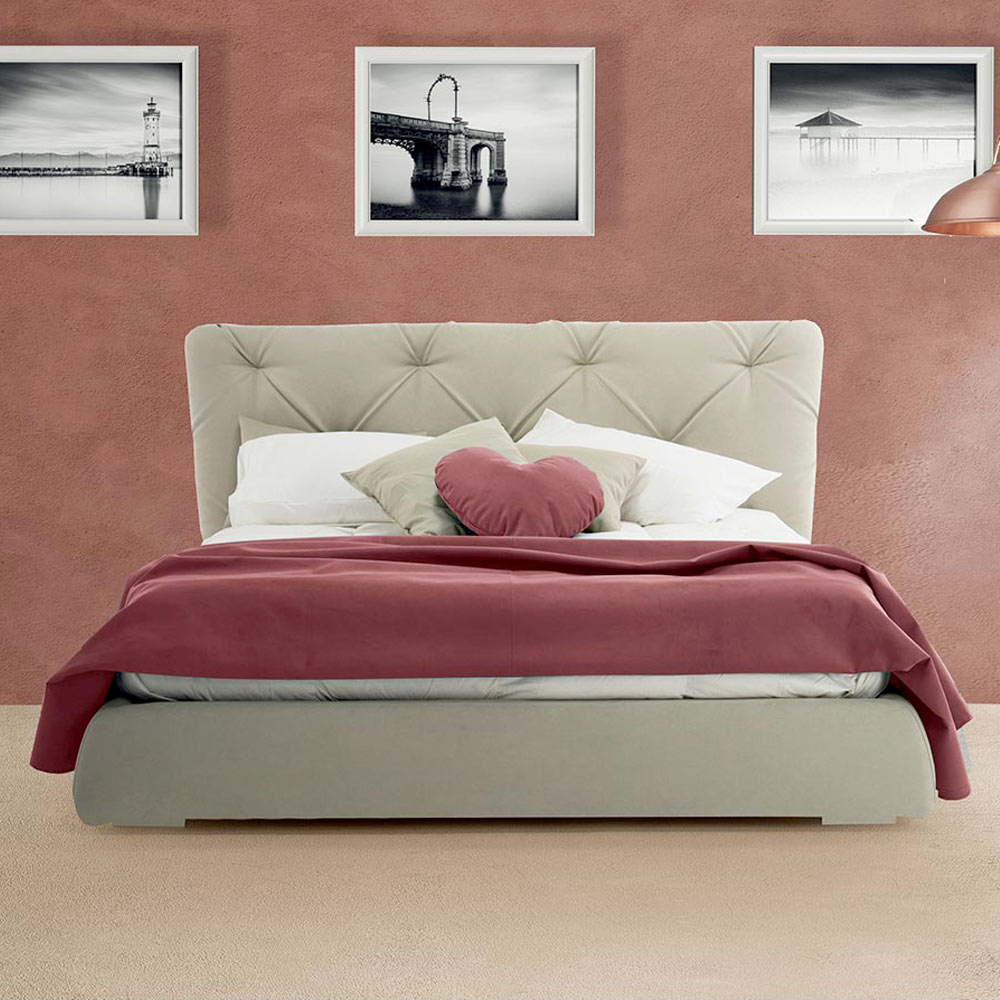 Nowoczesne podwójne łóżko z pojemnikiem, wyściełane i pokryte tkaniną lub ekoskórą, wykonane ręcznie we Włoszech.