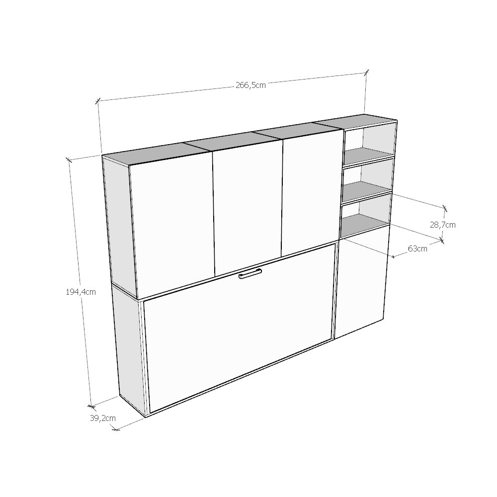 - SKŁAD A: jedna komora z drzwiami i wewnętrzną półką oraz cztery otwarte komory - Łóżko zamknięte przy ścianie: 266,5 x 39,2 x wysokość 129,7 cm / Łóżko otwarte: 266,5 x 106 x wysokość 129,7 cm
