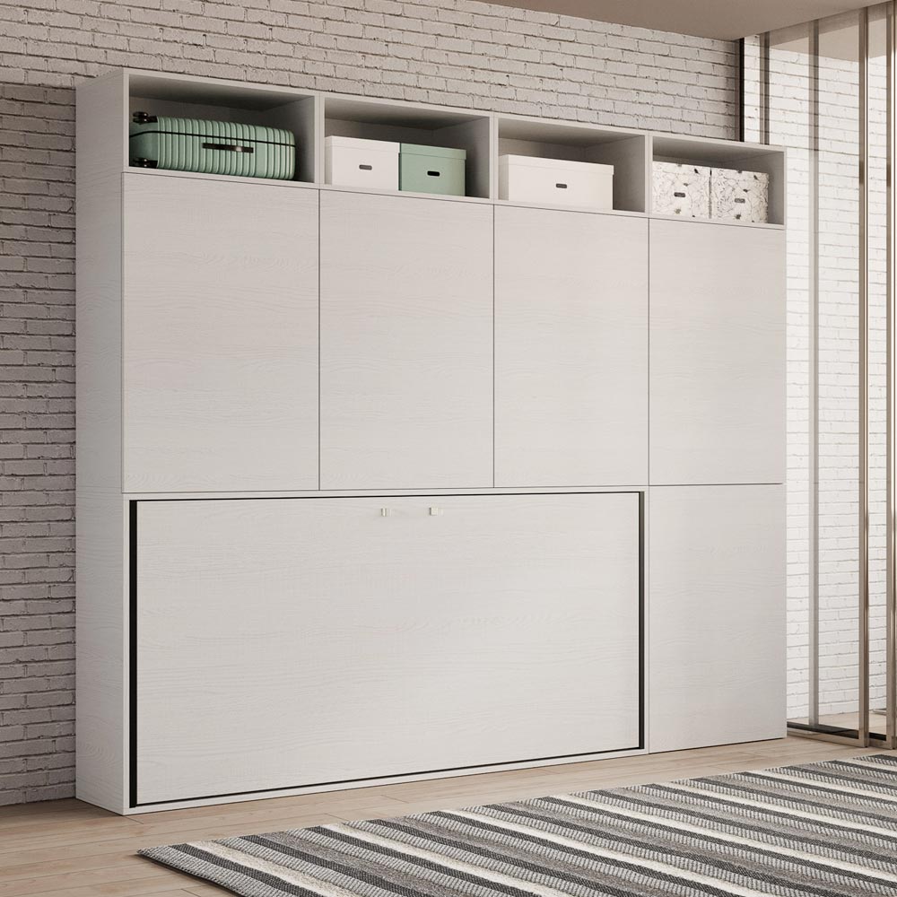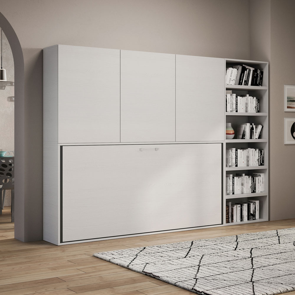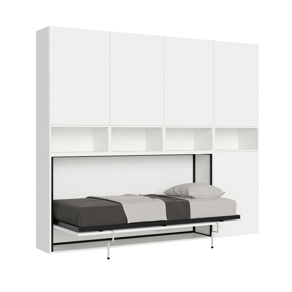- SKŁAD G : pojedyncze łóżko składane, które można przekształcić w regał/szafę na książki z dziewięcioma przegródkami (trzy z drzwiczkami i wewnętrzną półką oraz sześć otwartych) - Łóżko zamknięte przy ścianie: 266,5 x 39,2 x wysokość 194,4 cm / Łóżko otwarte: 266,5,9 x 106 x wysokość 194,4 cm
