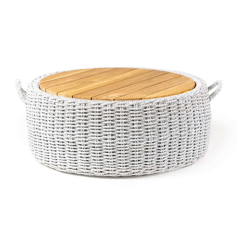 Ten zewnętrzny stolik kawowy jest wykonany z wewnętrznej struktury z epoksydowanego proszkowo malowanego aluminium ramą z podstawą z drewna tekowego i ręcznie tkaną wkładką z liny VRO.
