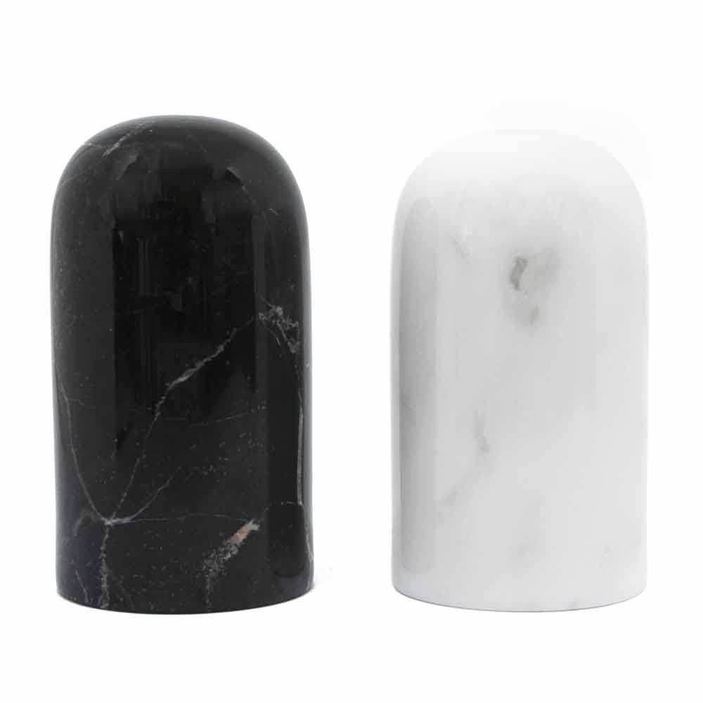 Pojemniki kuchenne na sól i pieprz z białego marmuru z Carrary i czarnej Marquinia Made in Italy.