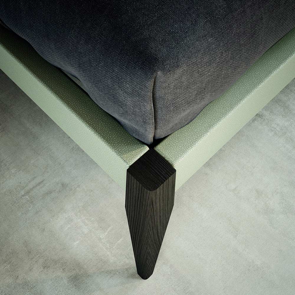 równowagę wizualną między obfitymi objętościami wezgłowia, wzbogaconymi szczególnymi szwami centralnymi, a stonowanymi i niezbędnymi liniami ramy łóżka. Elementy, które go otaczają, są z nim połączone, tworząc