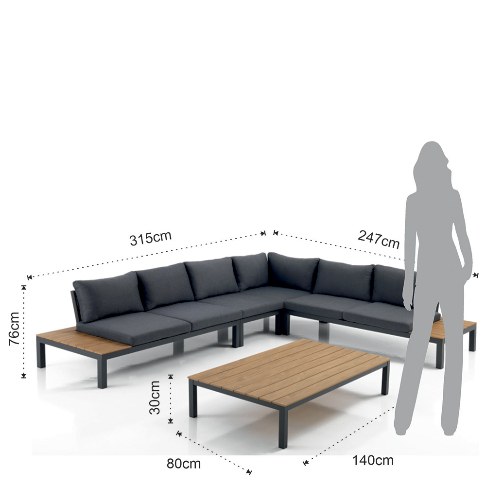 Ta narożna sofa ze stolikiem kawowym do ogrodu jest przykładem nowoczesnego luksusu na świeżym powietrzu . Połączenie solidnych konstrukcji aluminiowych i wykorzystania drewna poliwęglanowego w szczegółach stolika kawowego i końców sof tworzy elegancki i wyrafinowany kontrast wizualny. Grube, wygodne poduszki zapewniają przyjemne i relaksujące siedzenie, idealne na długie popołudnia lub wieczory towarzyskie pod gwiazdami.