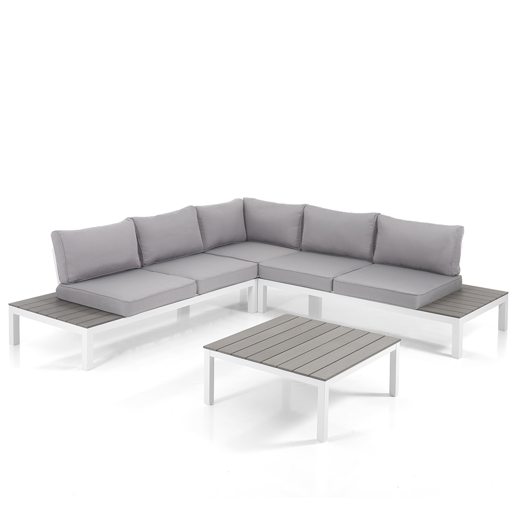 Ta narożna sofa i stół ogrodowy to kwintesencja eleganckiego relaksu i współczesnego stylu. Dzięki białej ramie i czystym liniom sofa stanowi elegancki, nowoczesny kontrast z ciepłym drewnem powierzchni do siedzenia i stołu, tworząc przyjazne otoczenie, które jest zarówno zachęcające, jak i estetyczne .