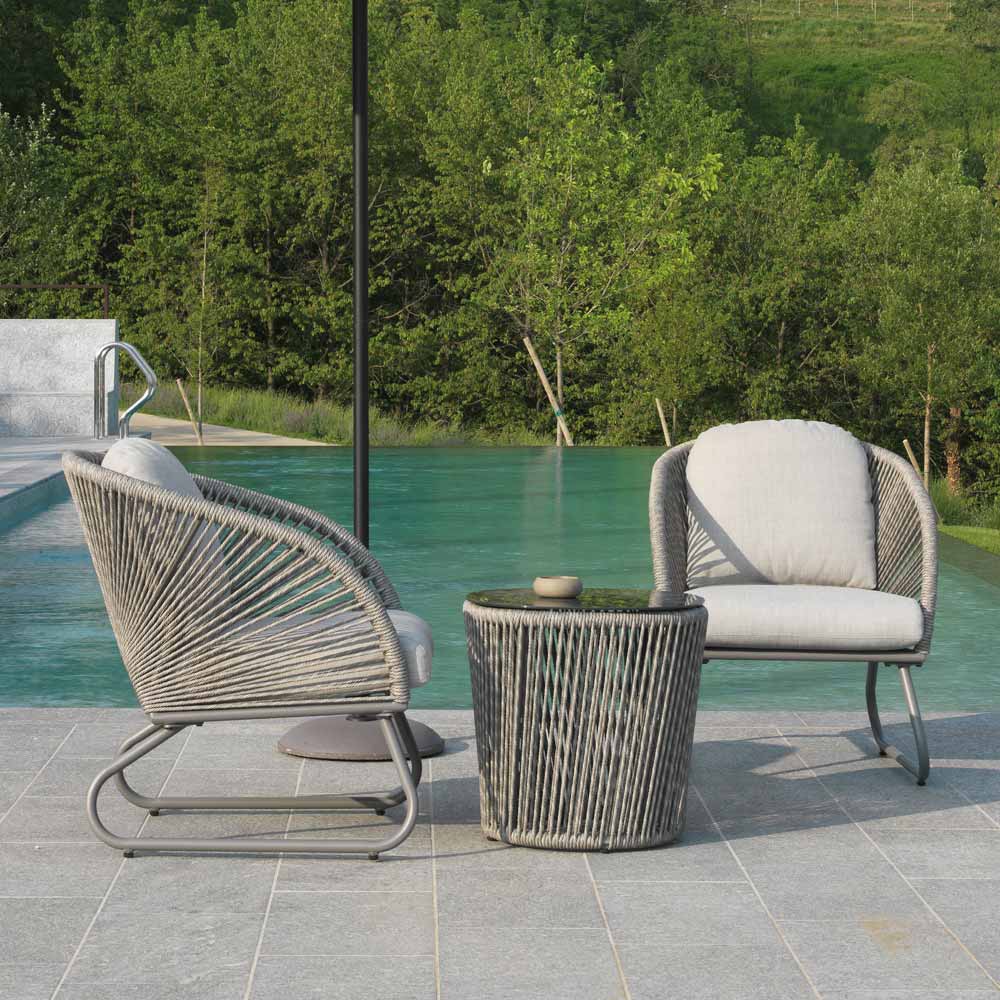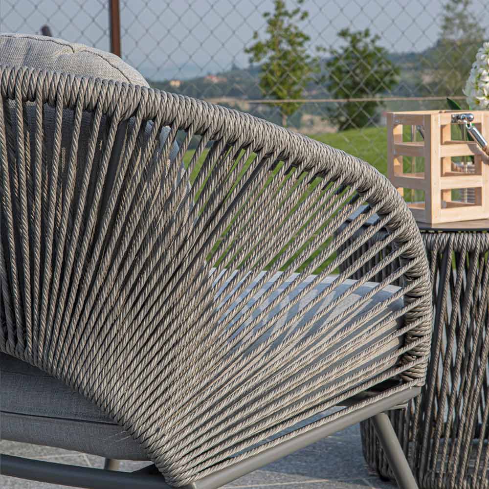 Rama wykonana jest z odpornego na warunki atmosferyczne poliestru i zamontowana na wytrzymałej aluminiowej podstawie, która zapewnia trwałość i stabilność. Antracytowo-szary kolor foteli harmonijnie łączy się z pasującym stolikiem kawowym, dopełniając elegancki i nowoczesny wygląd zestawu.