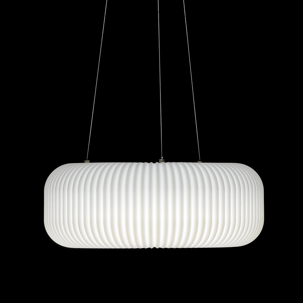 Lampa ta wyróżnia się eleganckim i minimalistycznym designem, który łączy cienkie metalowe kable z organicznie ukształtowanym plastikowym dyfuzorem. Plastik z plisowanymi detalami dodaje wizualnego wyrafinowania i pomaga delikatnie i równomiernie rozproszyć światło, tworząc przyjazną i relaksującą atmosferę.