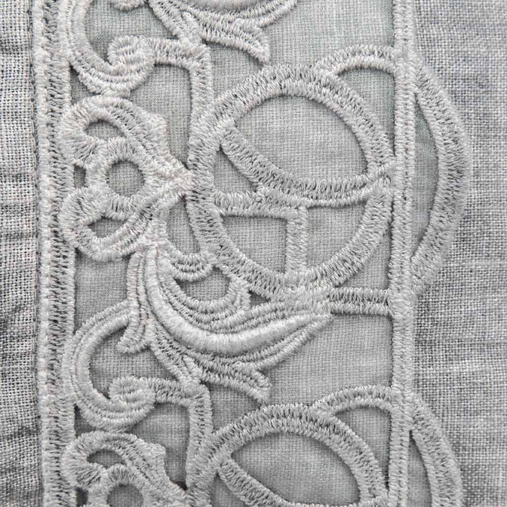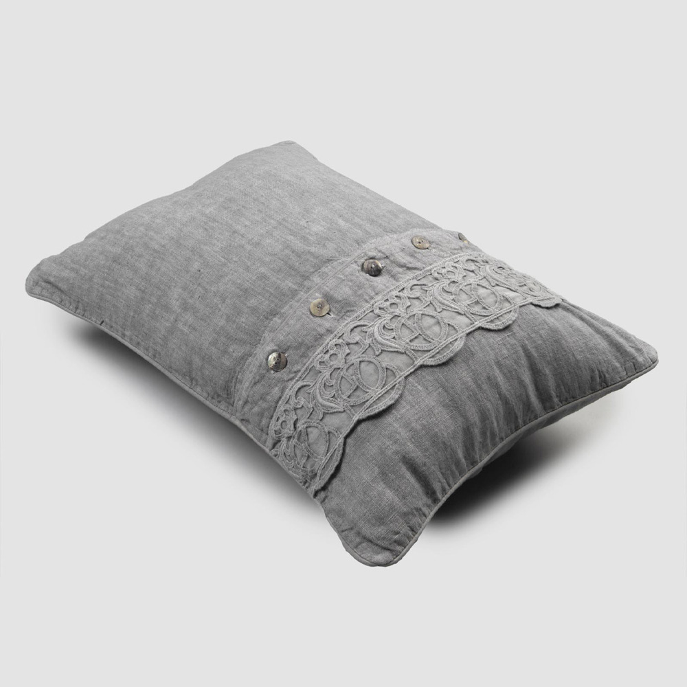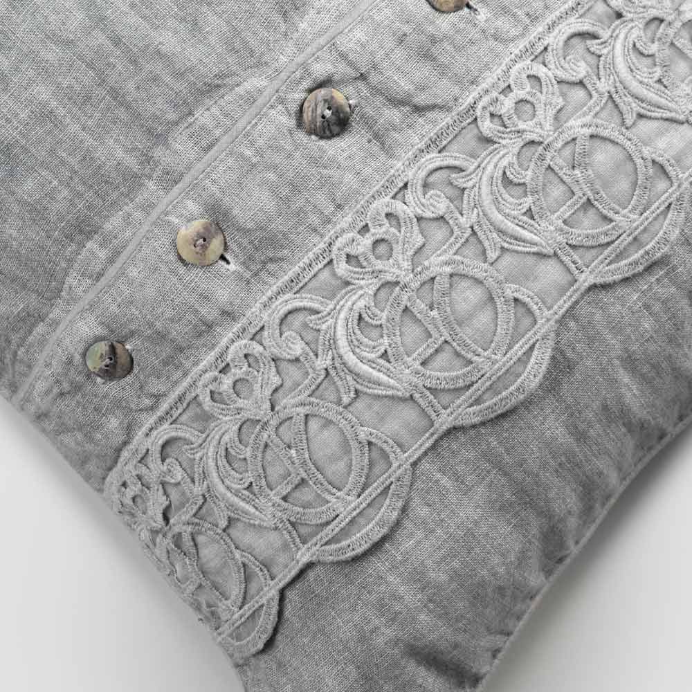 Poszewka z szarego lnu z synergiczną koronką, centralnymi guzikami i lamówką, luksusowa wyprodukowana we Włoszech.