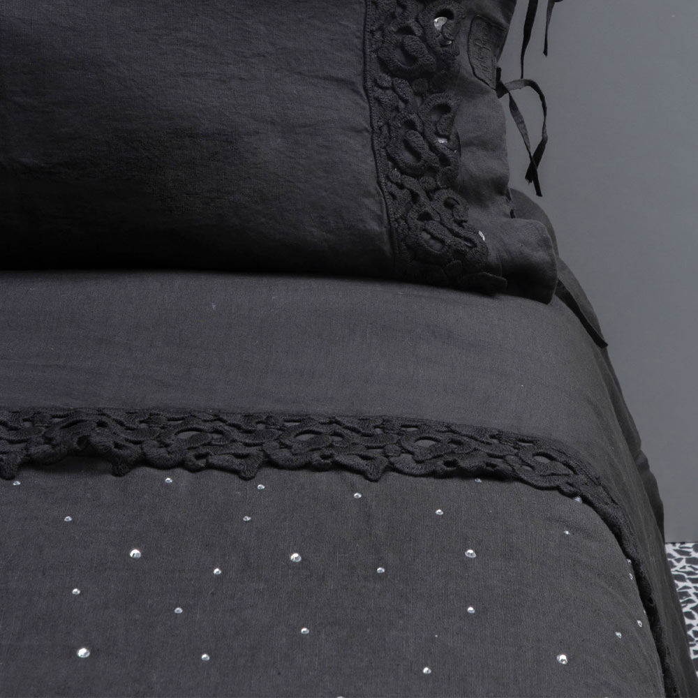 Podwójna poszwa na kołdrę z czarnego lnu z kryształkami, guzikami i luksusową klapką wyprodukowaną we Włoszech.