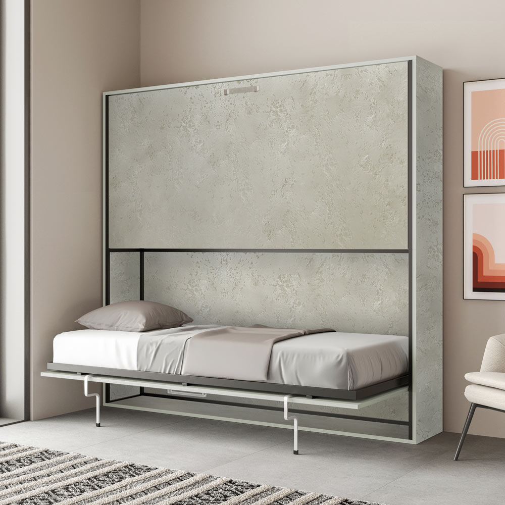 Łóżko składane poziome, wykonane ze stelażem z płyt wiórowych o grubości 18 mm, stelaż łóżka ze zbrojonego żelaza, malowanego proszkiem epoksydowym w kolorze wytłaczanego aluminium.