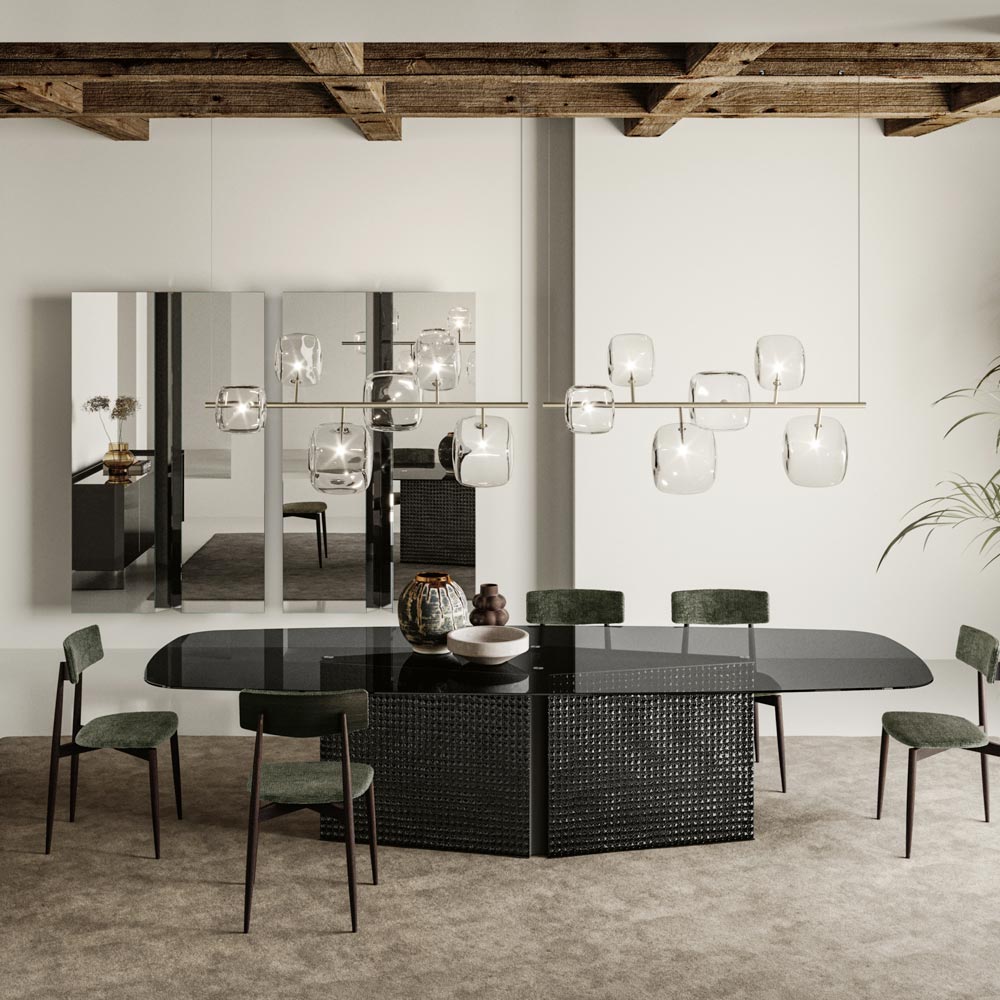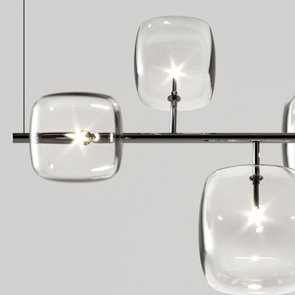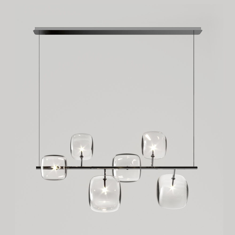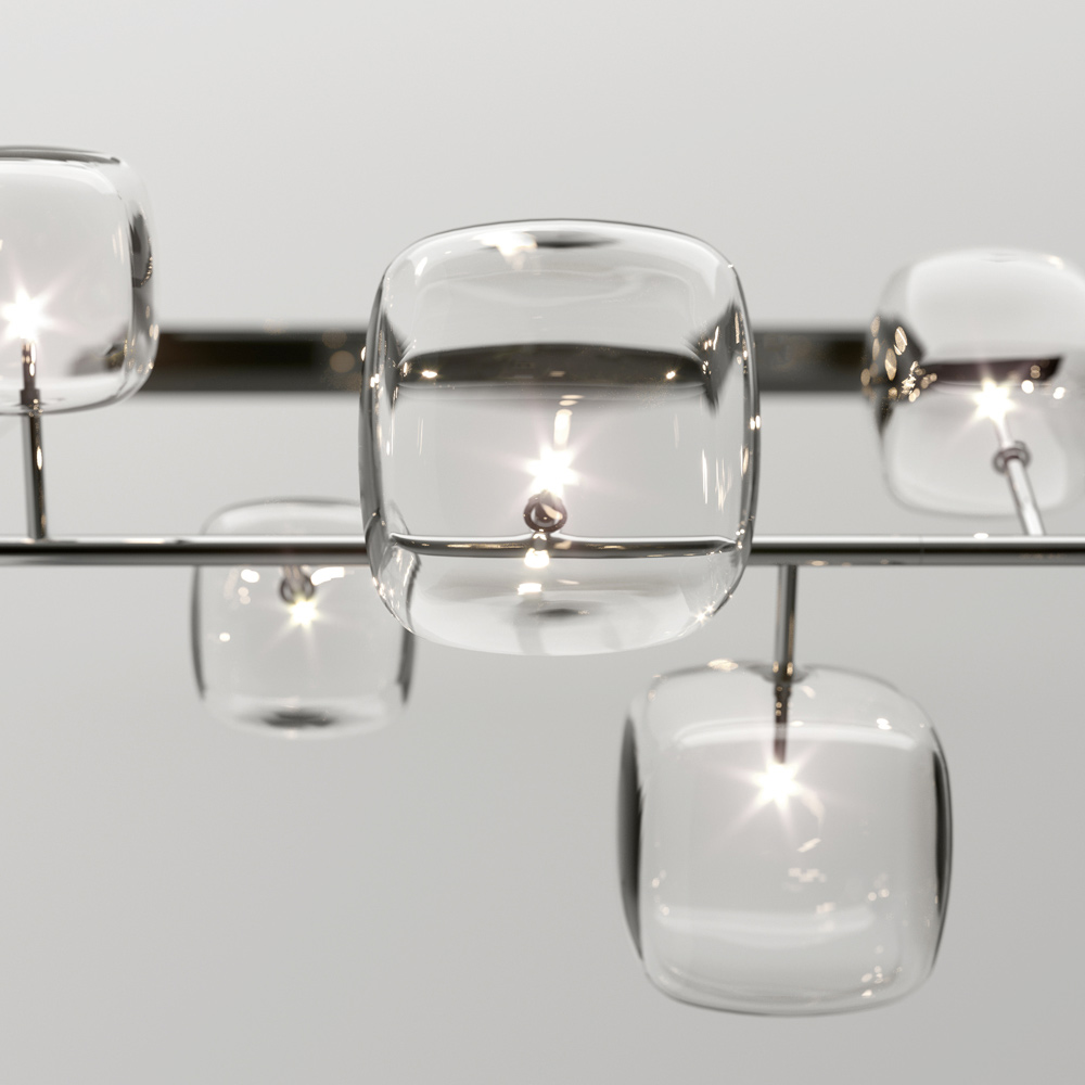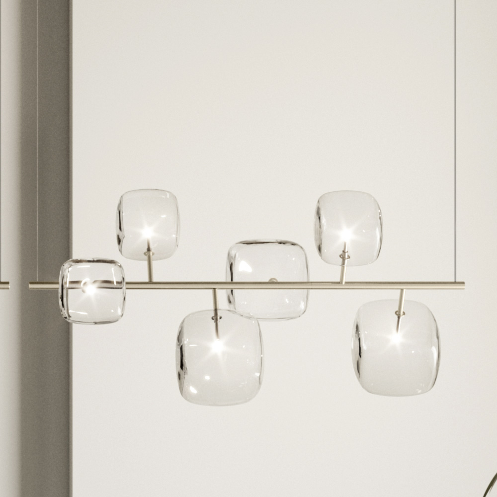 Pozioma lampa wisząca o metalowej konstrukcji i 6 sześciennych i zaokrąglonych strukturach z przezroczystego, dmuchanego szkła Pyrex, z 1 ściemnianą żarówką LED G4 3000K w każdej.