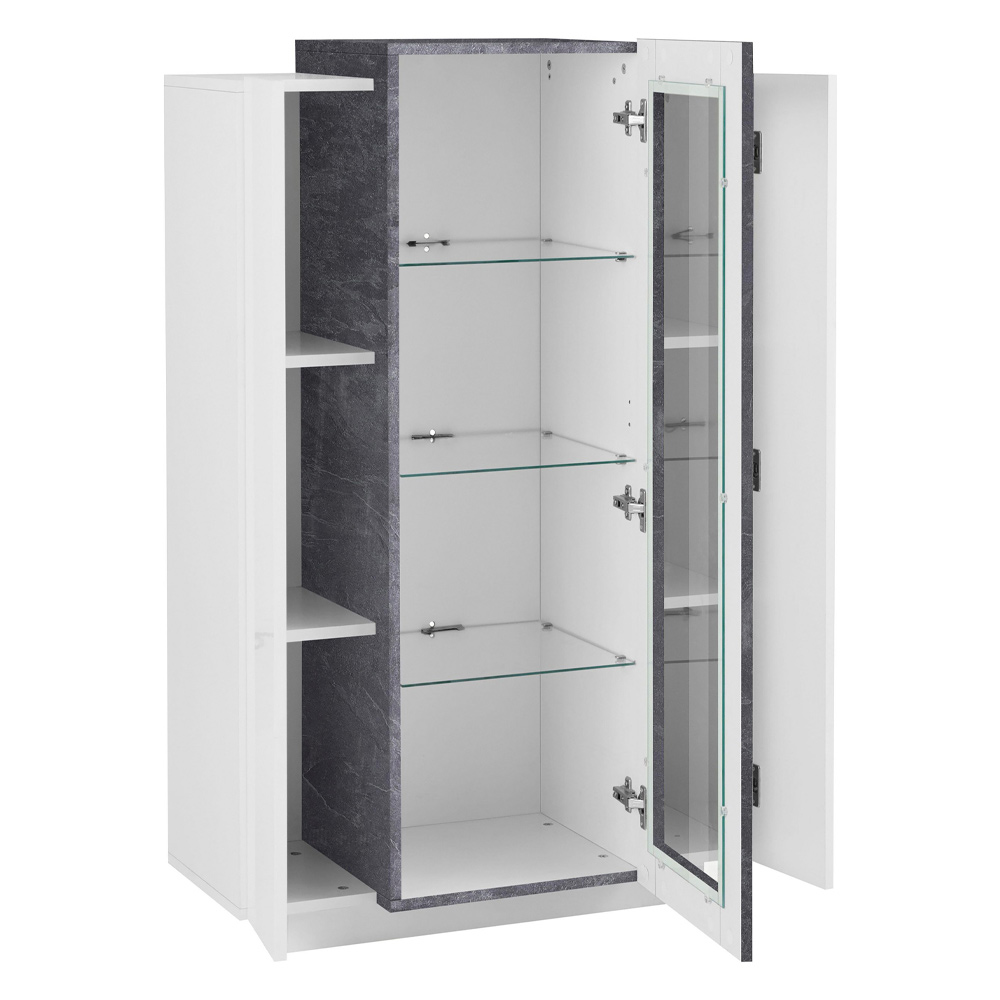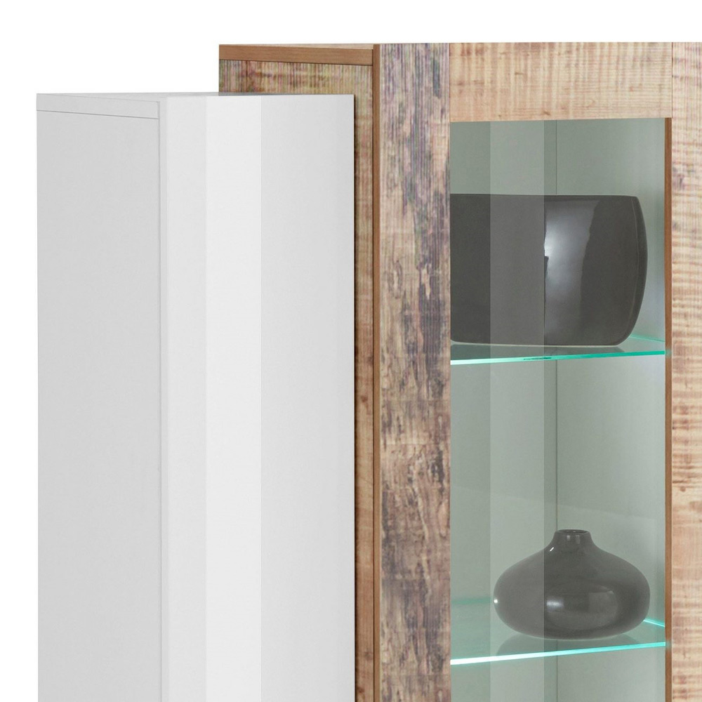 Właściwości techniczne:- Witryna z 3 drzwiami (2 drewniane z 2 wewnętrznymi półkami każda z drewna o wymiarach L 18,4 x G 29,5 x H 111,8 cm i 1 ze szkła z 3 wewnętrznymi szklanymi półkami L 36,8 x G 29,5 x H 11,8 cm)
