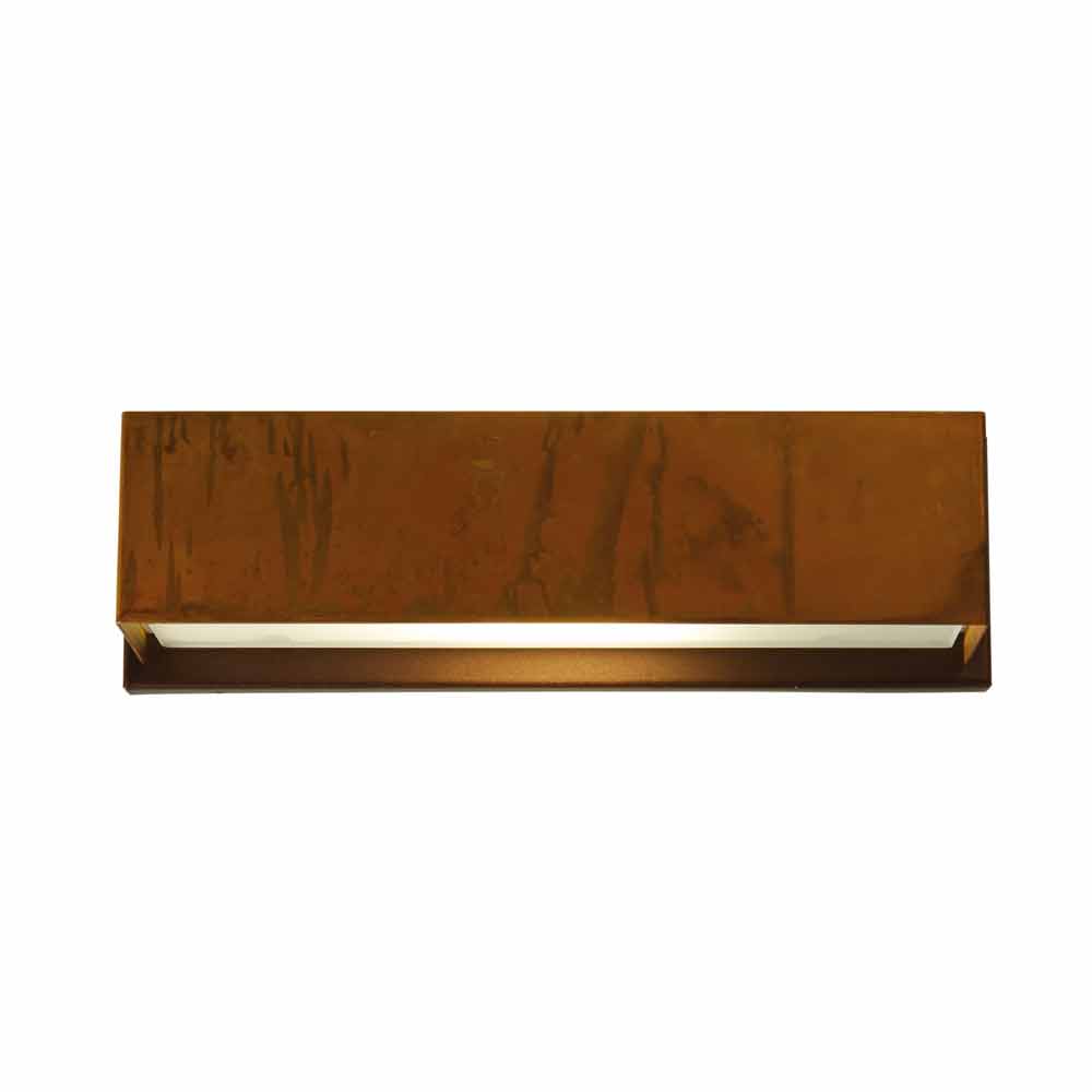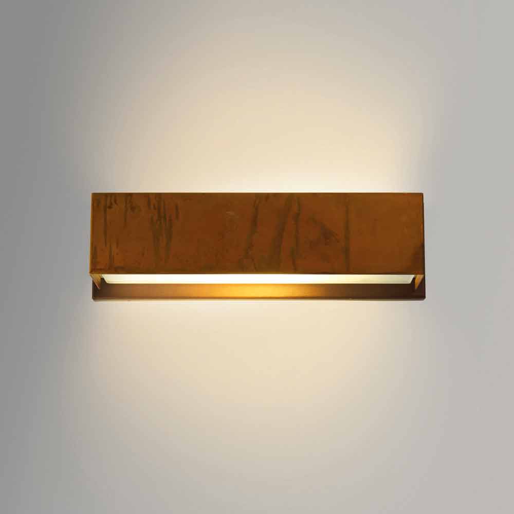 Kinkiet ze strukturą z oksydowanego mosiądzu i podstawy w stali malowanej proszkami epoksydowymi. Dostępne w dwóch rozmiarach w kształcie okrągłym lub kwadratowym. Hartowany klosz zapewniający bezpośrednią i pośrednią emisję światła.