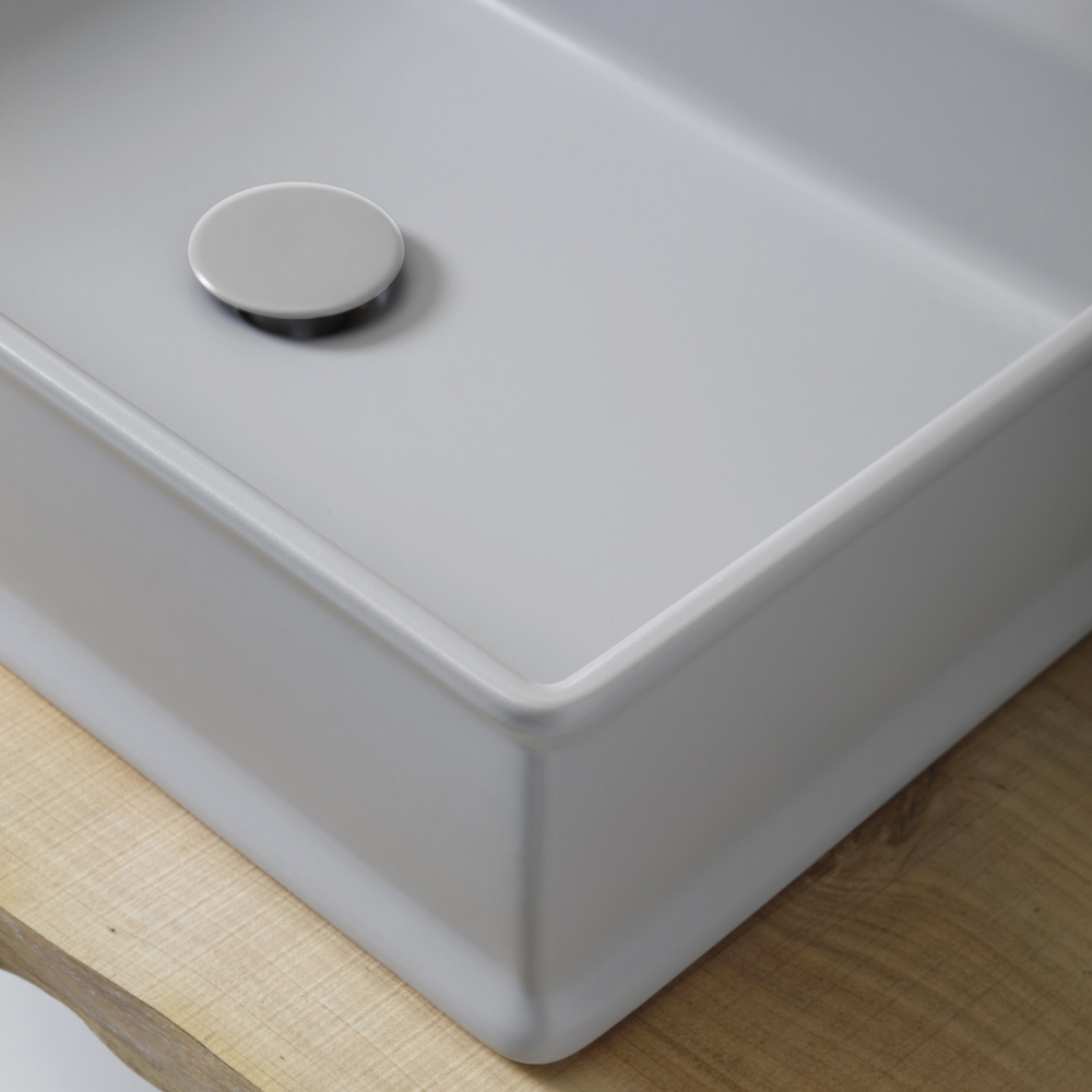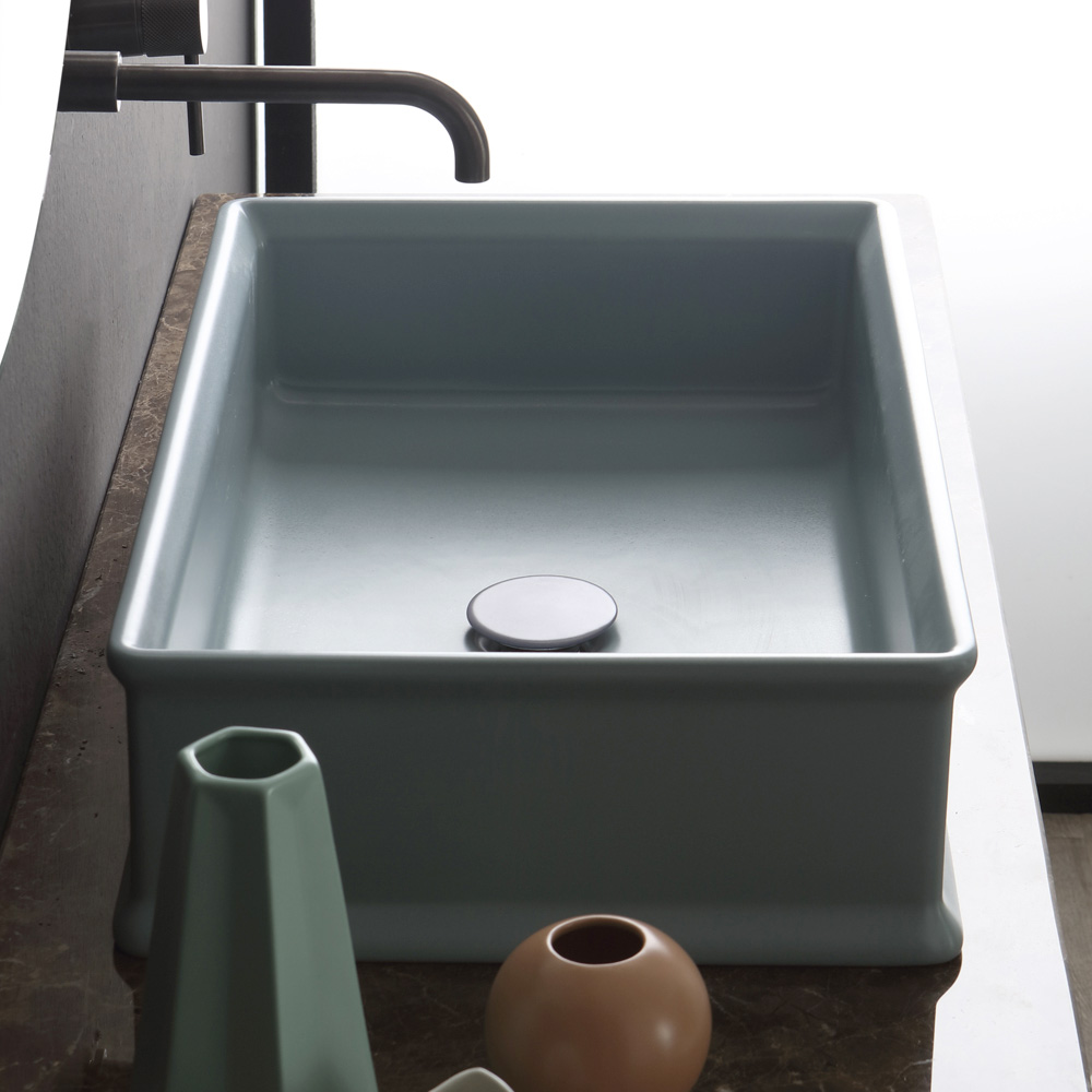 Prostokątna umywalka nablatowa wykonana z nieprzezroczystej kolorowej ceramiki dzięki kunsztowi 100% Made in Italy . Projekt charakteryzujący się mocnymi i imponującymi liniami i cechami sprawia, że ten mebel jest doskonałą współczesną reinterpretacją estetyki z duszą retro, dzięki zastosowaniu koloru, który daje życie ekskluzywnemu i wyrafinowanemu efektowi .