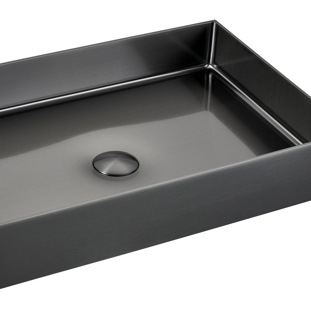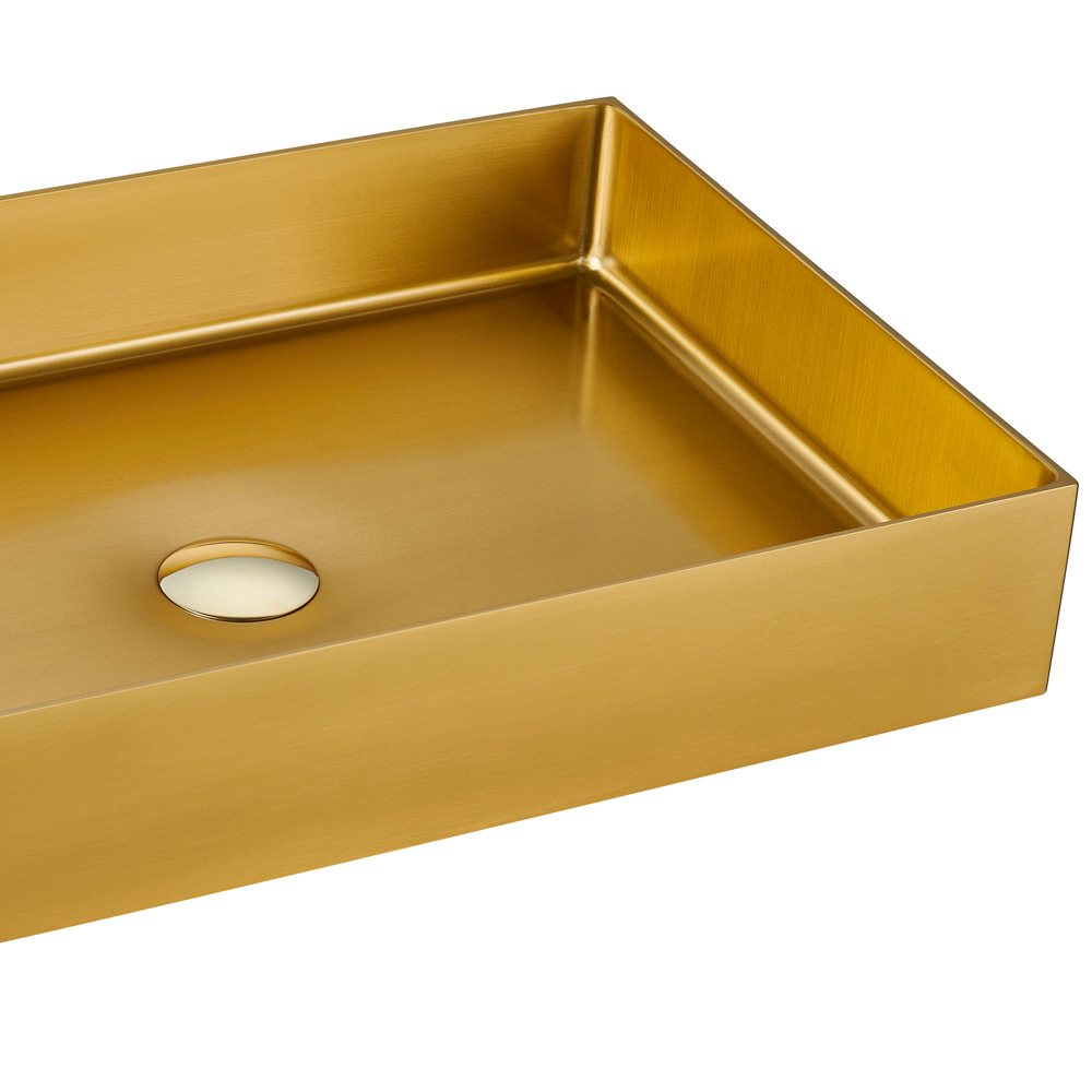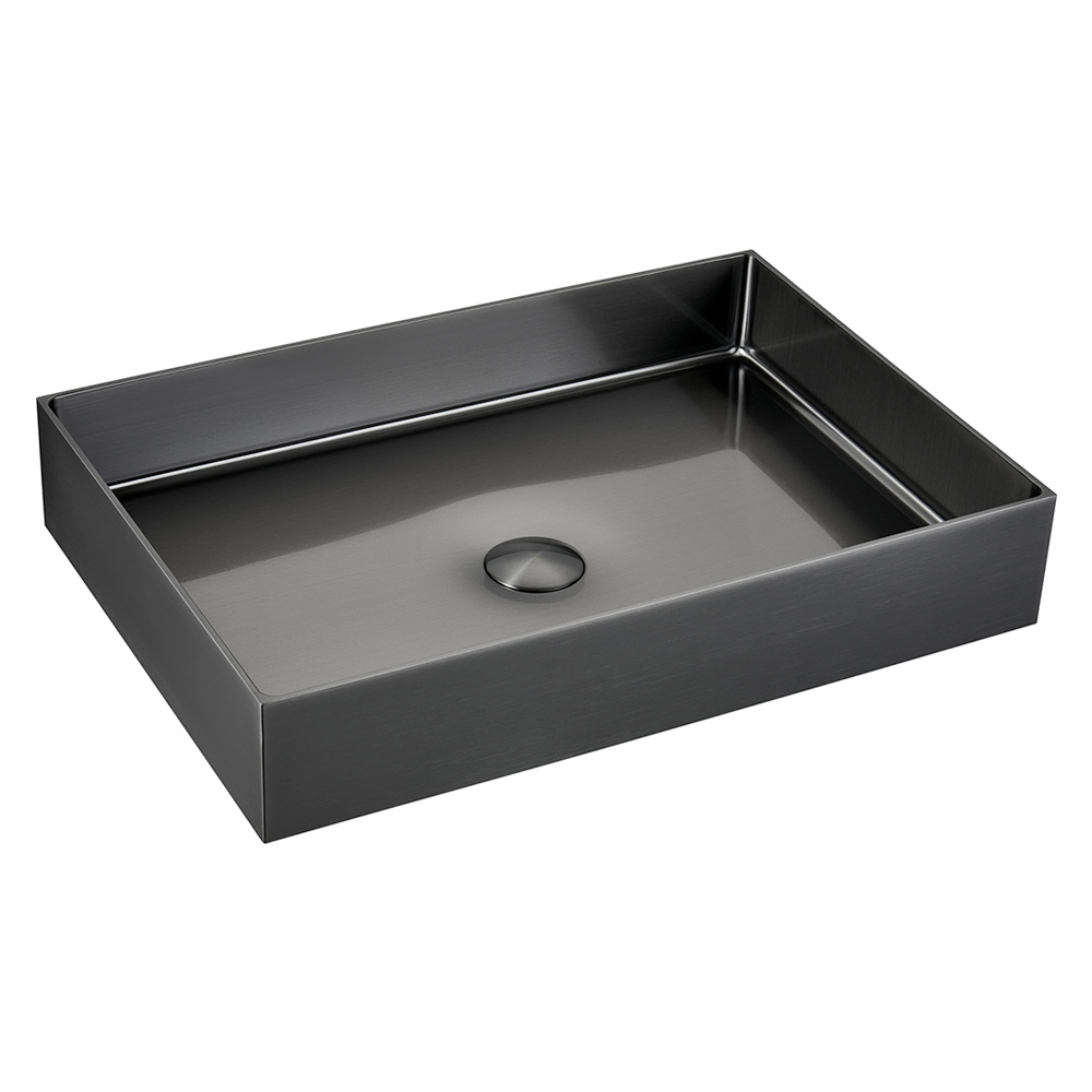 Prostokątny zlew nablatowy wykonany ze stali nierdzewnej SUS 304 o grubości 3 mm to klejnot designu i funkcjonalności. Wykonany z jednego arkusza metalu, oferuje czystą, nowoczesną estetykę. Wykończenie powłoką PVD+Nano w połączeniu z dokładnym szczotkowaniem nadaje przedmiotowi atrakcyjny i niemal enigmatyczny wygląd, zwiększając połysk oraz odporność na plamy i zarysowania. Projekt charakteryzuje się wyważonymi kształtami i idealnymi proporcjami, dostępnymi w trzech wykończeniach , które elegancko dopasowują się do każdego otoczenia. Co więcej, wyrafinowane detale, takie jak dopasowana pokrywa odpływu i całkowity brak widocznych spawów, podnoszą ten zlew do rangi prawdziwego arcydzieła rzemiosła i wzornictwa, czyniąc go wyróżniającym się elementem łazienek o luksusowym i współczesnym smaku.
