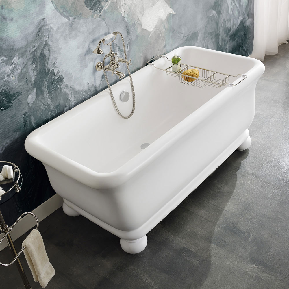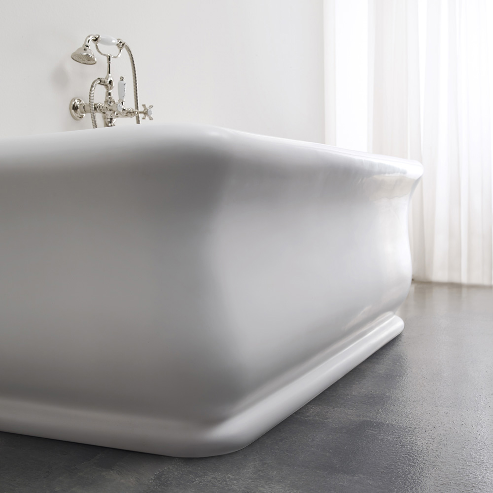 Prostokątna biała wanna z Solid Surface, mieszanki żywicy akrylowej modyfikowanej związkami mineralnymi, z przelewem do kolumny odpływowej. Oryginalna wanna o wysokości 4 stóp z opcjonalną solidną powierzchnią . Do wyboru biały matowy lub błyszczący .