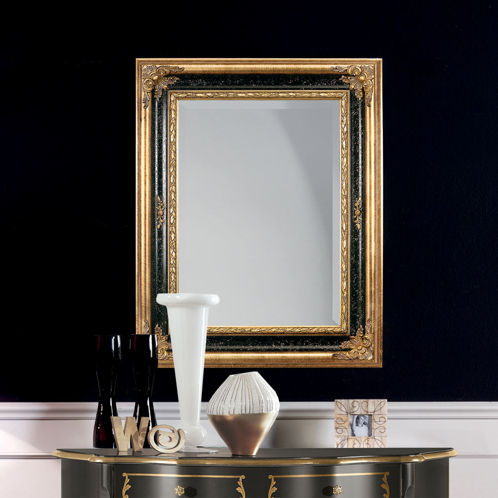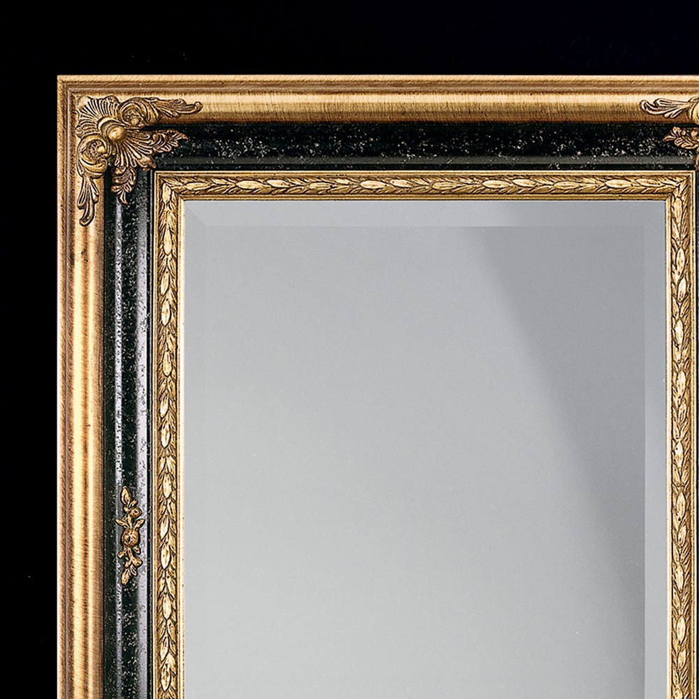 Eleganckie prostokątne lustro z drewnianą ramą ozdobioną złotym płatem i czarnym lakierem. Dzięki klasycznemu stylowi lustro to jest idealne do nadania każdemu pomieszczeniu eleganckiego i luksusowego charakteru.