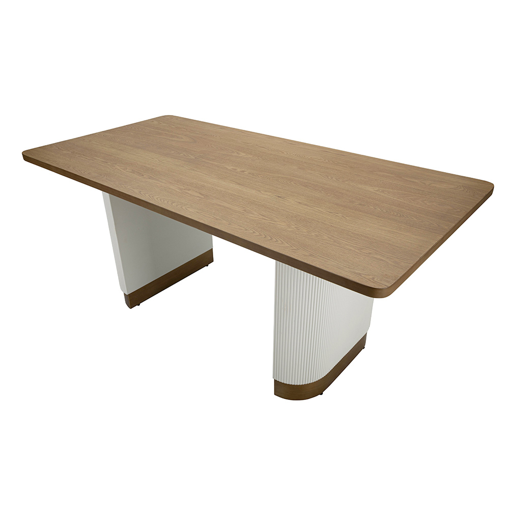 Ten stół do jadalni to nienaganna synteza stylu i funkcjonalności , mebel zaprojektowany, aby wzbogacić każde otoczenie swoją dyskretną, ale charakterystyczną obecnością. Powierzchnia MDF o ciepłych, naturalnych odcieniach harmonijnie kontrastuje z białą podstawą z pionowymi rowkami, oferując wyrafinowaną fakturę wizualną i design inspirowany elementami klasycznej architektury.