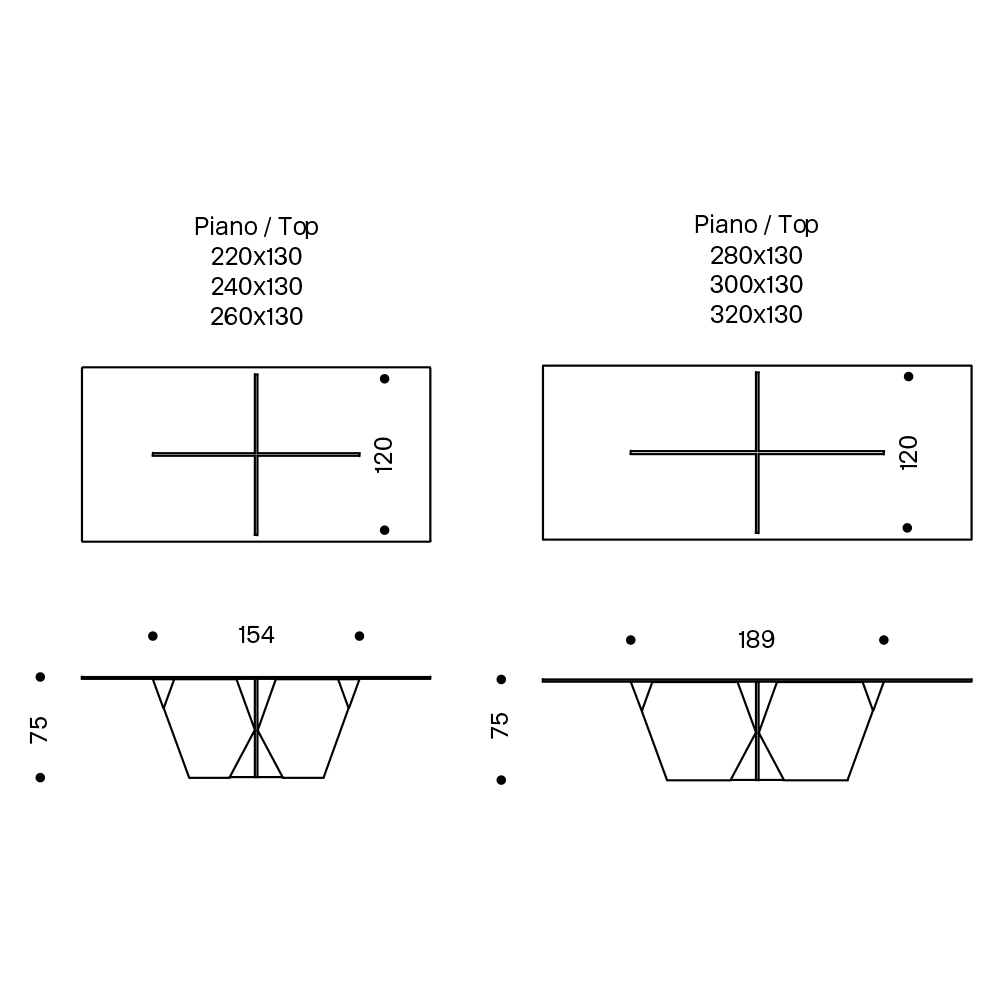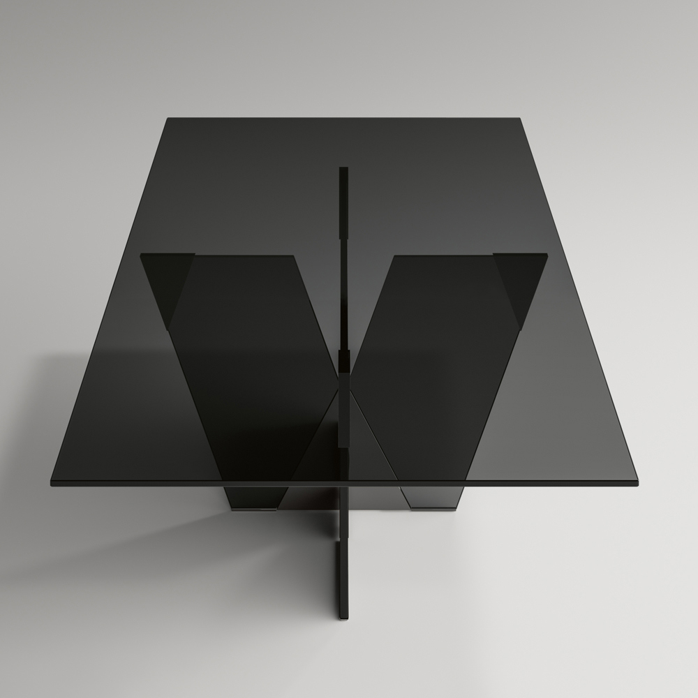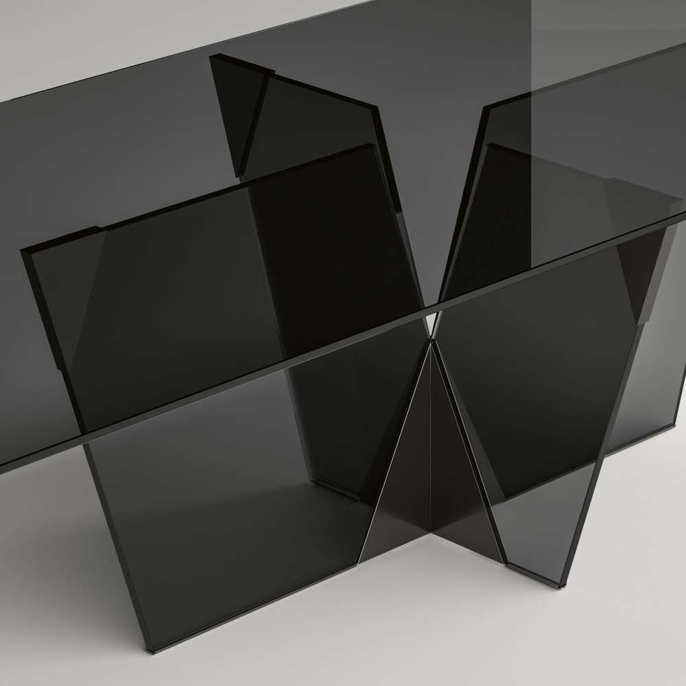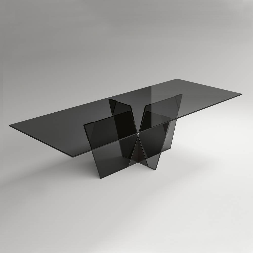 elegancką i rzeźbiarską strukturą , powstał z połączenia materiałów o różnym charakterze z pasją do obróbki szkła, dzięki czemu udało się zdefiniować reprezentację siły i charakteru poprzez różne kształty i grubości. Mocną stroną jego estetyki jest podstawa architektoniczna charakteryzująca się piramidalnym połączeniem wykonanym z metalu, które stanowi zasadniczą część produktu. Metalowe elementy dopełniają projekt stołu nadając kształt szklanej podstawie i dodając jej osobowości i oryginalności.