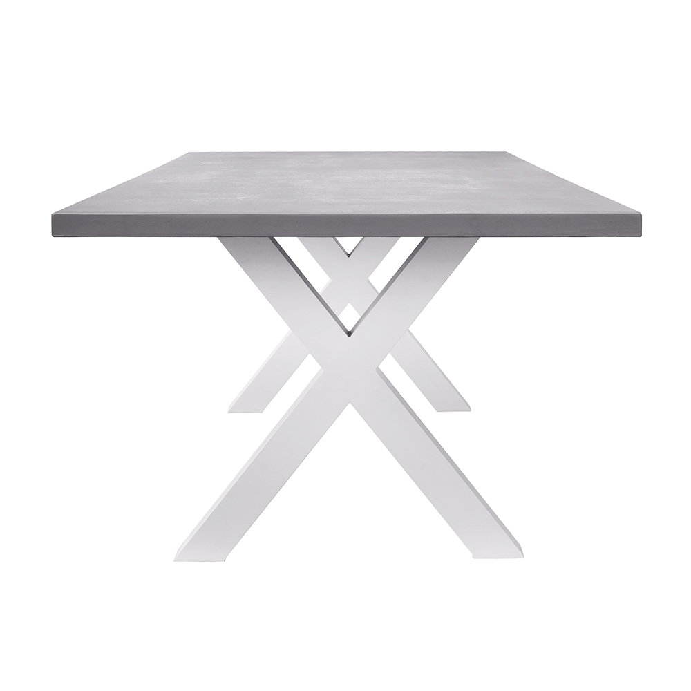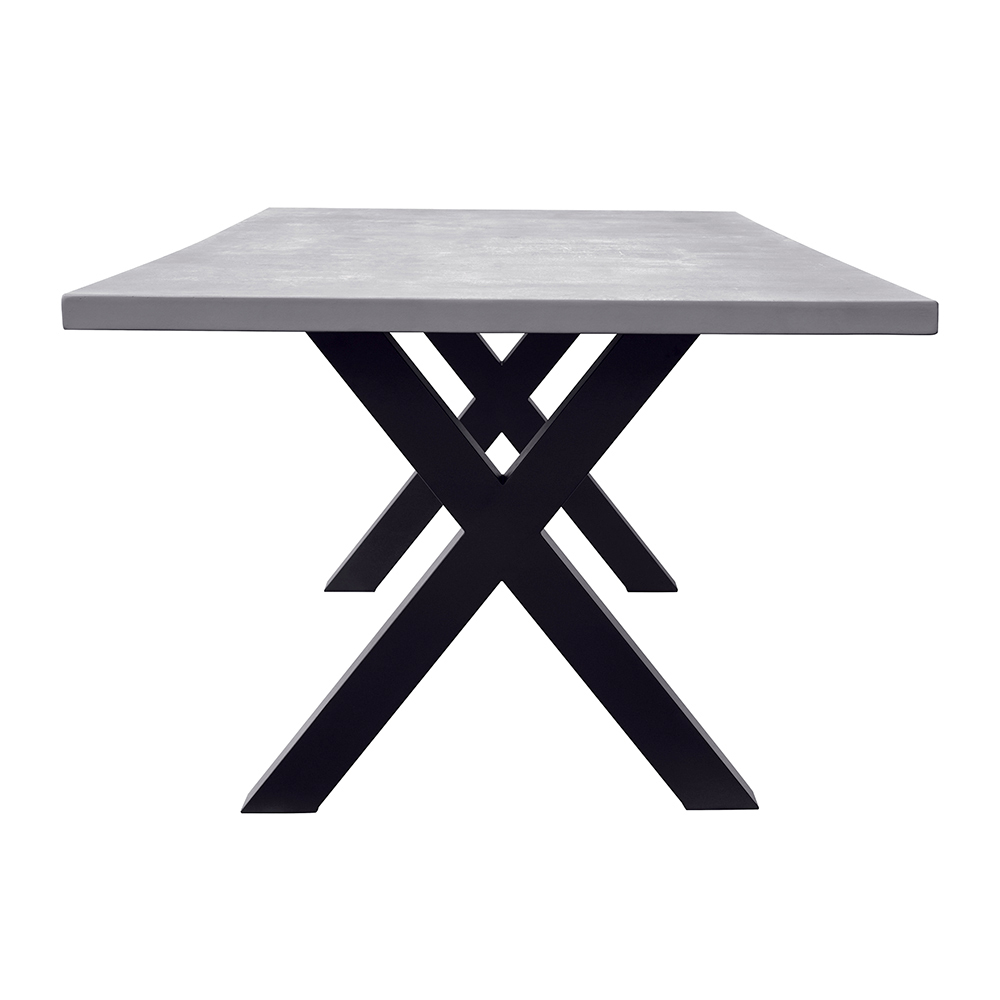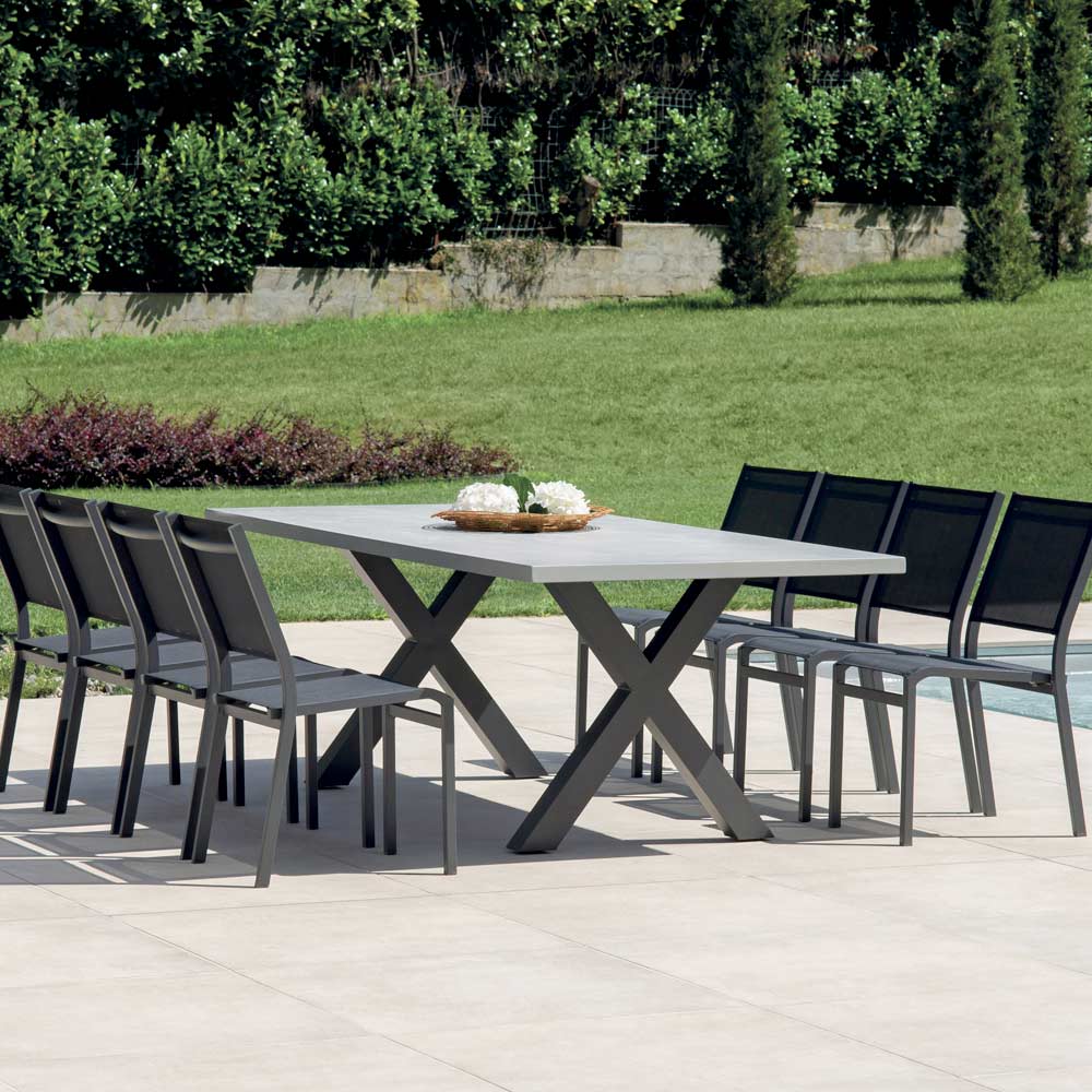 Szary, żywiczny blat łączy elegancję i praktyczność, zapewniając trwałą, łatwą w czyszczeniu powierzchnię, odporną na warunki atmosferyczne. Skrzyżowane aluminiowe nogi nadają konstrukcji dynamiczny, nowoczesny wygląd, zapewniając jednocześnie stabilność i solidność.