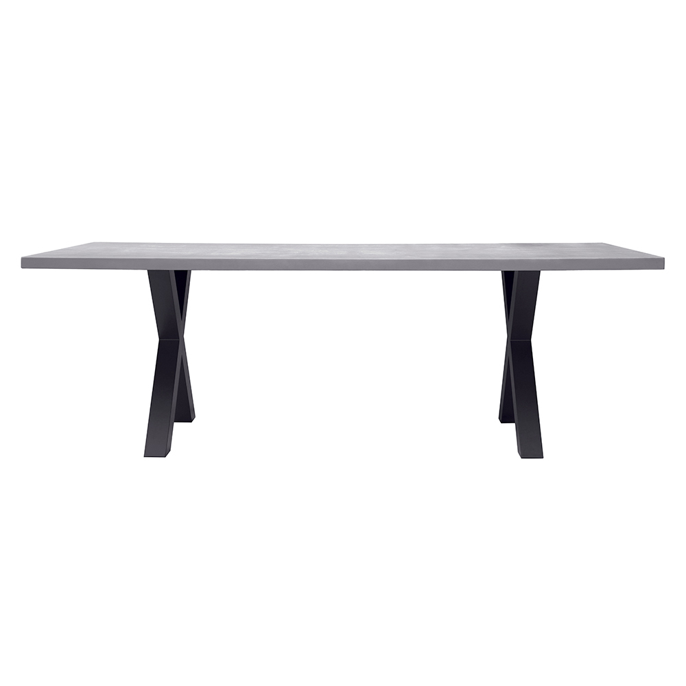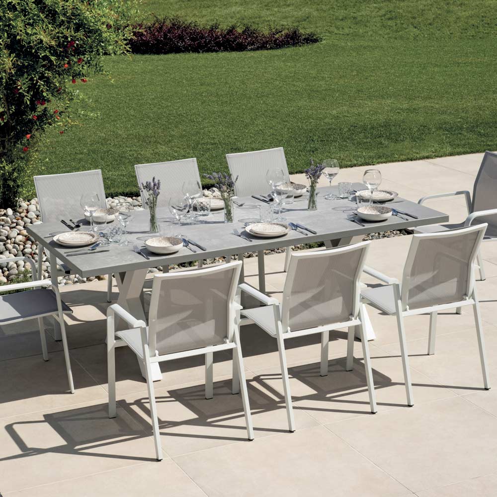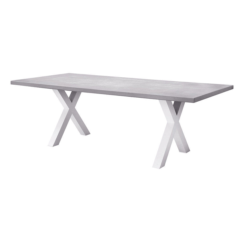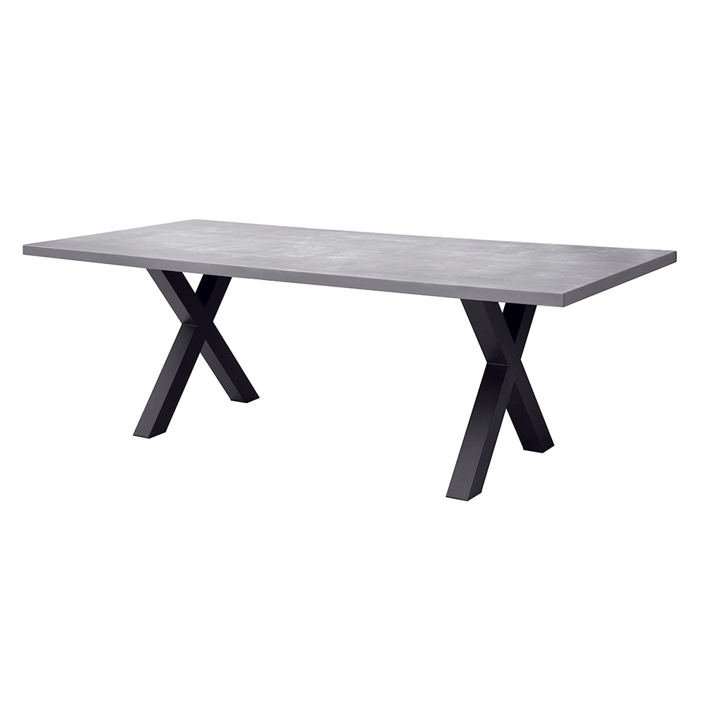 Szary, żywiczny blat łączy elegancję i praktyczność, zapewniając trwałą, łatwą w czyszczeniu powierzchnię, odporną na warunki atmosferyczne. Skrzyżowane aluminiowe nogi nadają konstrukcji dynamiczny, nowoczesny wygląd, zapewniając jednocześnie stabilność i solidność.