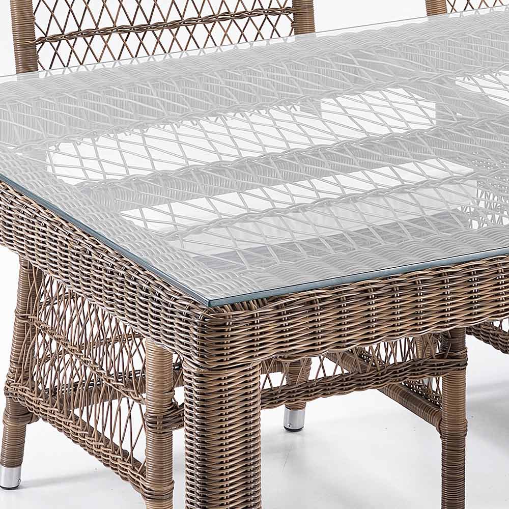 prostokątny stół do jadalni na świeżym powietrzu Gigi ma konstrukcję z ramą wykonaną z malowanego proszkowo aluminium, na której wysokiej jakości włókno Polyrattan marki Rehau o grubości 3 mm jest ręcznie tkane. Dodatkowo stół jest wyposażony w szklany blat o grubości 8 mm, przez który prześwituje ręcznie tkana rozeta.