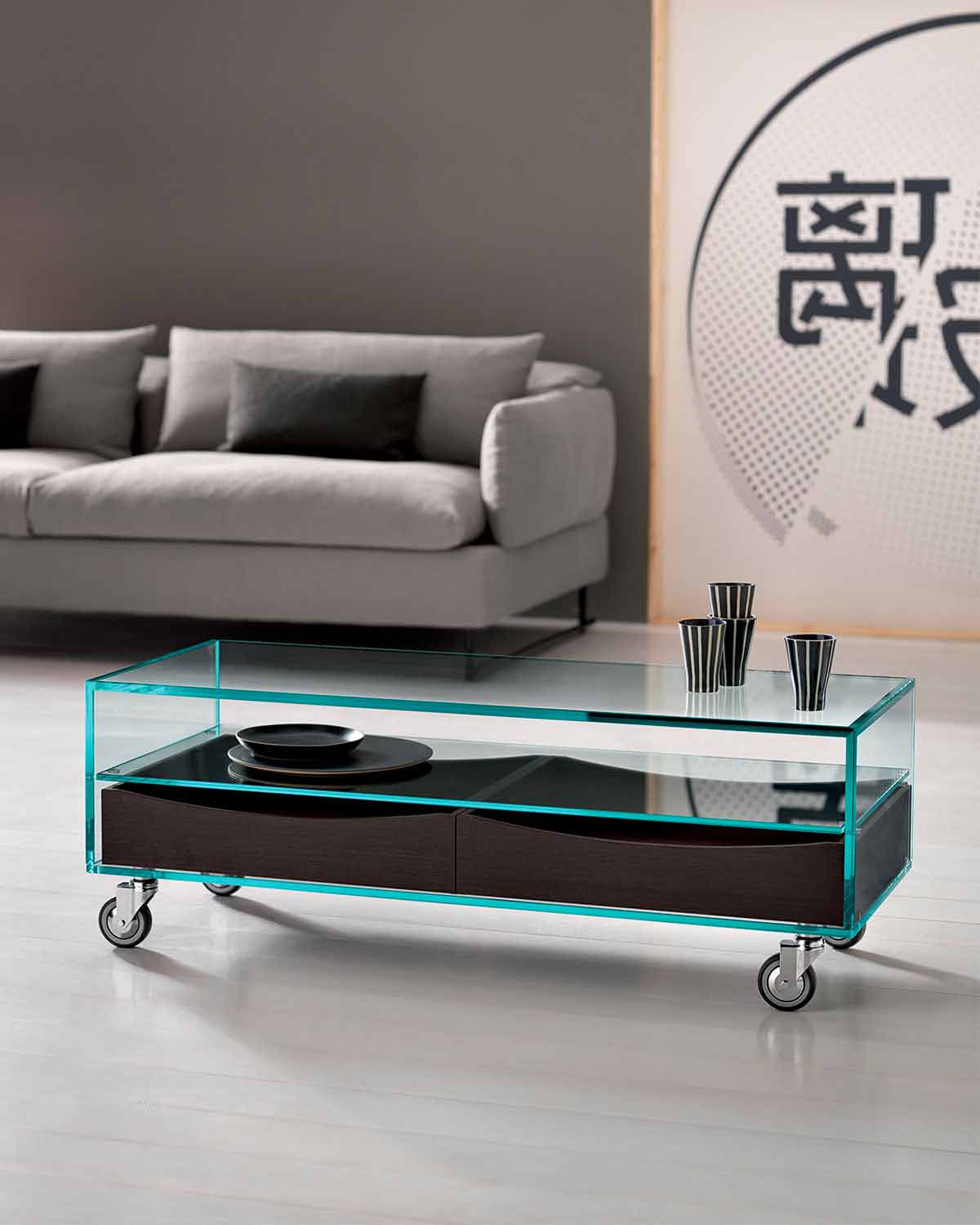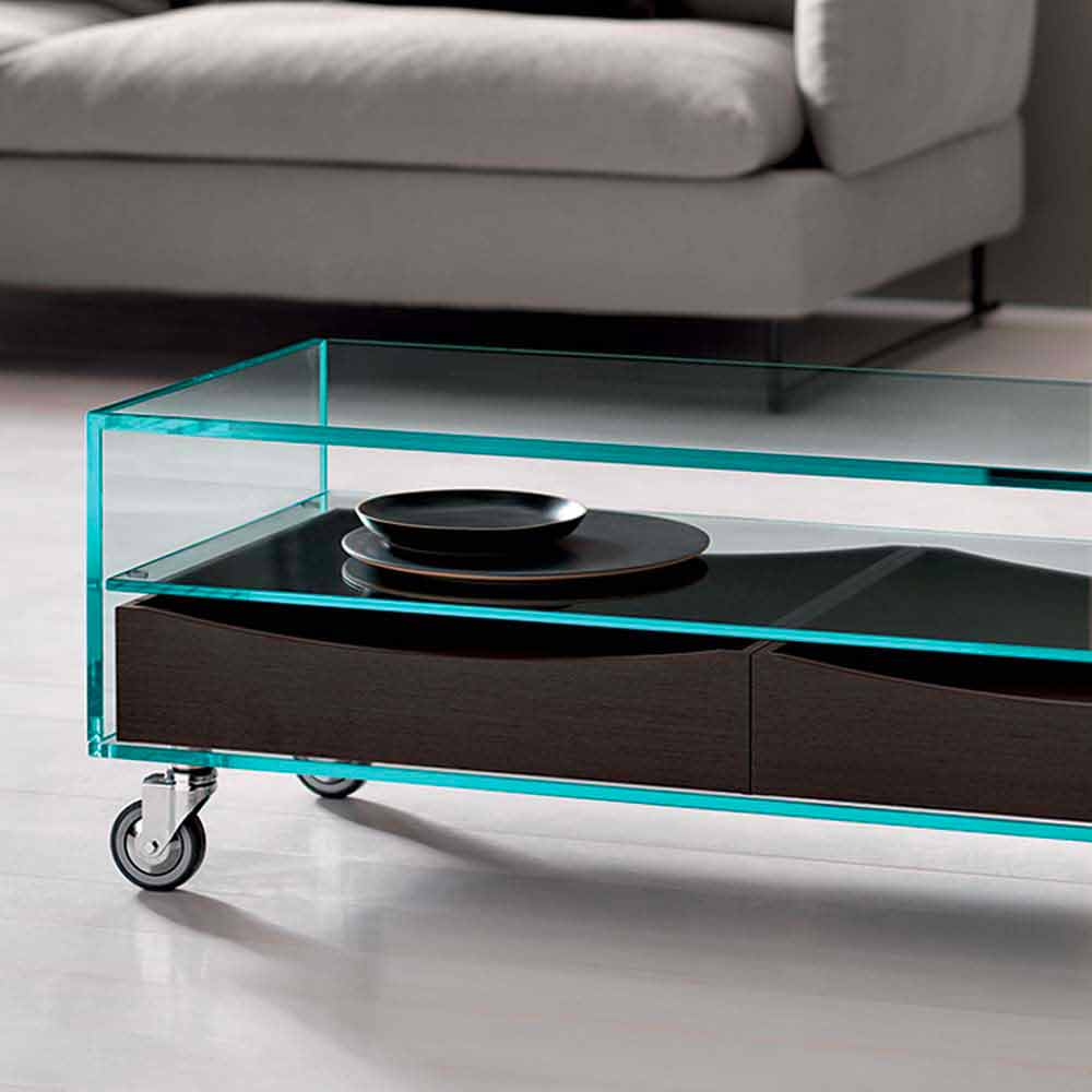 Ganzo to elegancki luksusowy stolik kawowy do salonu wykonany ręcznie we Włoszech z wysokiej jakości materiałów . Realizowany ze strukturą z dodatkowego szkła na kółkach z półką i dwiema szufladami z drewna wengè. Dzięki jego prostym, oryginalnym i czystym liniom idealnie sprawdzi się w każdym środowisku, zarówno krajowym, jak i kontraktowym.