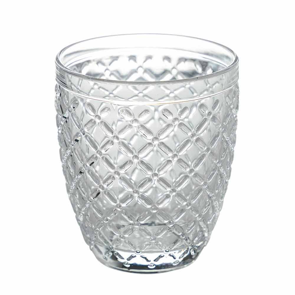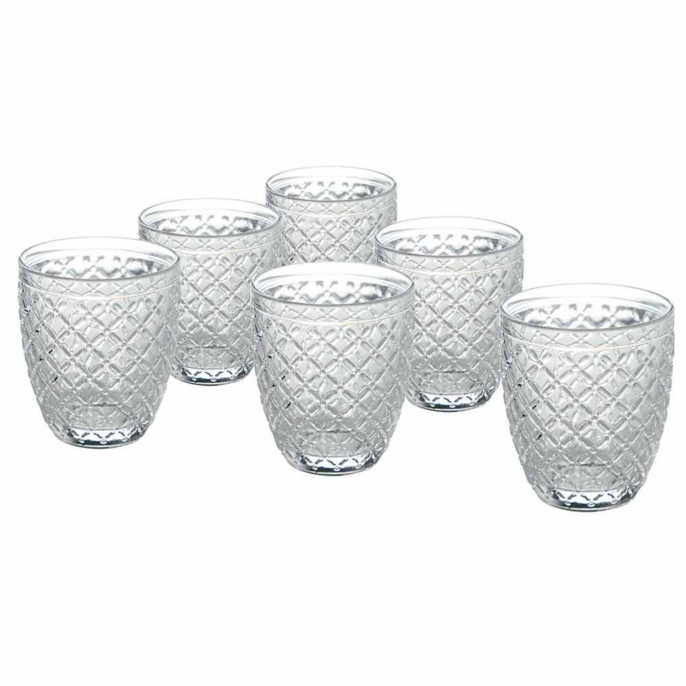 Zestaw przezroczystych kolorowych szklanek do wody ze szkła z rzeźbionymi dekoracjami, 12 sztuk.