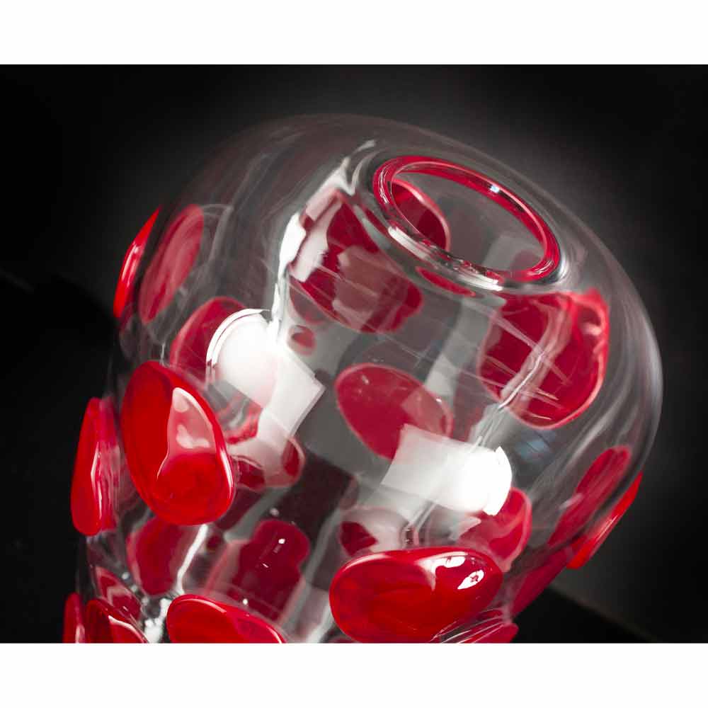 Elegancki wazon do wnętrz z przezroczystego dmuchanego szkła Murano z okrągłymi detalami w kolorze jasnoczerwonym wykonanym w procesie całkowicie Made in Italy . Uzupełnienie, które łączy w sobie niezwykłą elegancję szkła Murano i jego wspaniałe cechy z nowoczesnym i żywym wzornictwem, aby ożywić ideę ekskluzywnych i awangardowych mebli, które mogą wzbogacić każdą przestrzeń domową bez odrobiny koloru . Idealny styl dla najróżniejszych środowisk, od wyposażenia domu po wyposażenie hoteli, restauracji, stref kontraktowych, spa, ale także jako oprawa imprez i wesel.