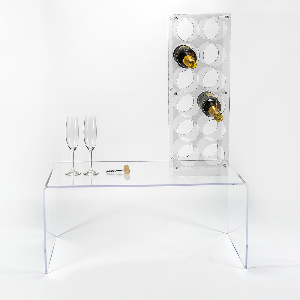 Wyprodukowano we Włoszech 12-miejscowy stojak na butelki z przezroczystego pleksiglasu i drewna.