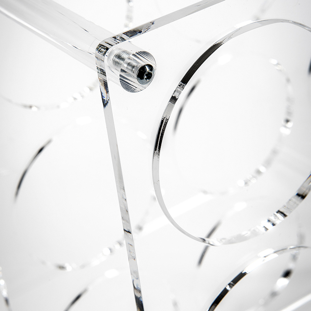 Stojący na podłodze stojak na butelki w całości wykonany we Włoszech z pleksiglasu PMMA 100% z pierwotnego polimeru i drzewnego liścia esencji, pozwala na przechowywanie do 12 butelek wina i szampana. Praktyczny do utrzymania porządku w winach i napojach, doskonale sprawdza się jako designerski mebel dzięki swojej funkcjonalnej estetyce i oryginalnemu kształtowi przypominającemu kształt beczki na wino.