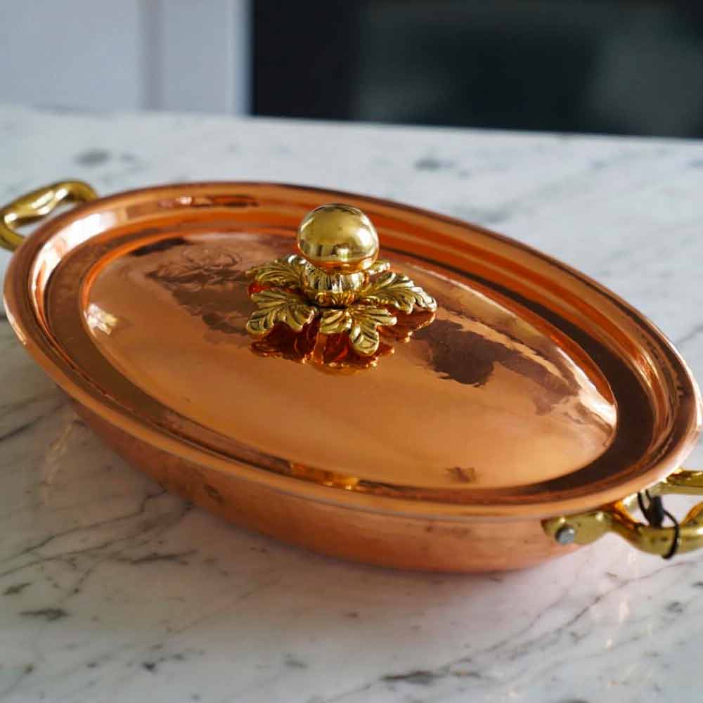 Patelnia owalna z pokrywką, ręcznie cynowana praca z miedzi z mosiężnymi uchwytami wyprodukowana we Włoszech.