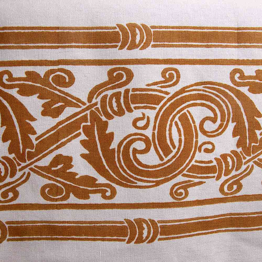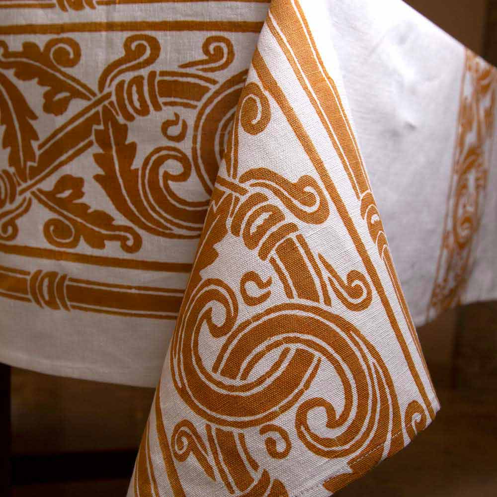 Wysoko wykonany włoski obrus lniany i bawełniany wykonany z delikatnym i artystycznym nadrukiem w kolorze rdzy wzdłuż krawędzi i na środku, ręczna robota na ekskluzywnych antycznych tkaninach wyprodukowanych we Włoszech.