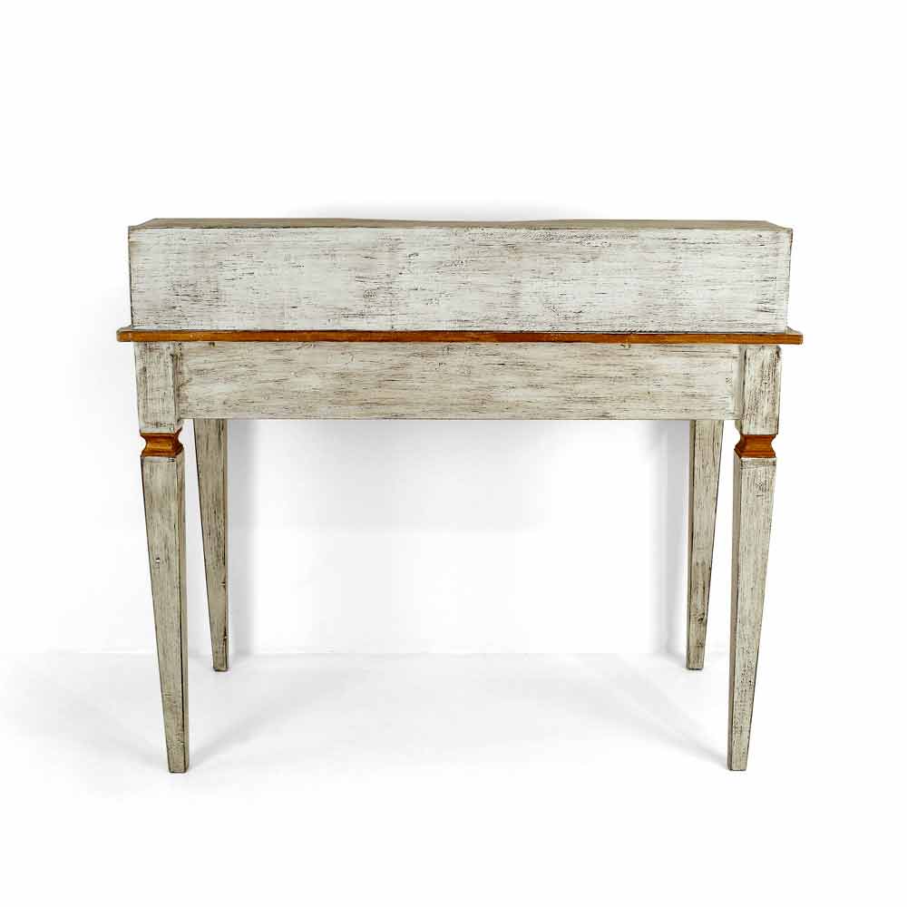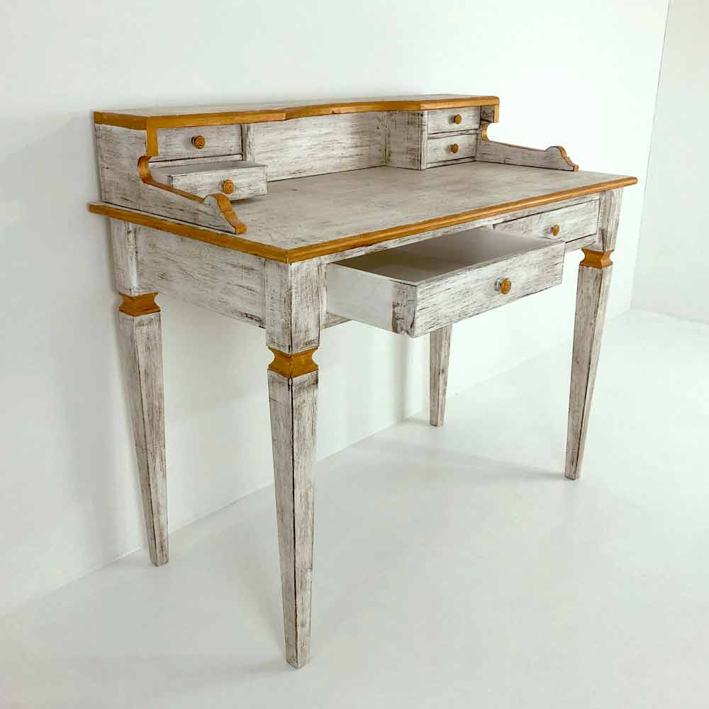 Biurko wykonane ręcznie we Włoszech z litego drewna jodłowego z postarzanym białym wykończeniem wzbogaconym profilami i detalami w kolorze antycznego złota. Jego konstrukcja posiada również praktyczny, łatwo wyjmowany backsplash, który pozwala uzyskać w sumie 6 szuflad, idealnych do aranżacji i uporządkowania przedmiotów.