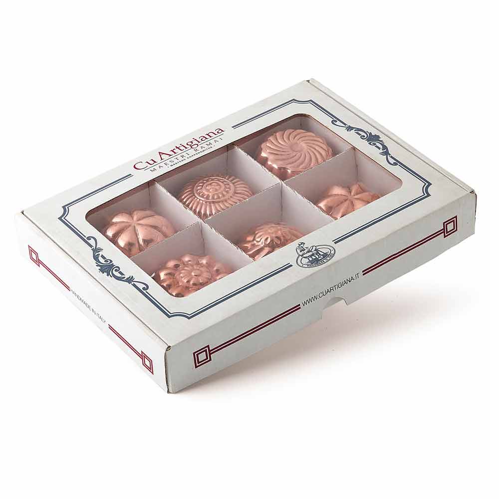 Ręcznie cynowane miedziane foremki do ciasta różne ozdoby z mosiężnym pierścieniem, 6 sztuk wyprodukowane we Włoszech.
