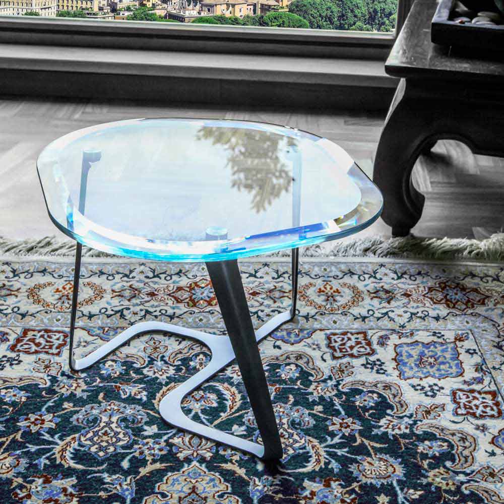 Oryginalne kształty i materiały o swoistej elegancji ożywiają rewolucyjny mebel stworzony z myślą o tych, którzy kochają nieprzewidywalny i całkowicie nowatorski styl. Cienkie i delikatne linie stalowej konstrukcji nawiązują do nieregularnych i wyjątkowych cech, stanowiąc solidne oparcie dla stolika kawowego. Blat jest na nich delikatnie osadzony, bardzo czysty i ultra-przejrzysty, którego blask przypomina ten z prawdziwego drogocennego diamentu, po którym ślizga się światło, tworząc cudowną grę kontrastów. Wybór użycia szlachetnych surowców, obrobionych ręcznie z dbałością o szczegóły, pozwala na stworzenie ekscentrycznego stolika kawowego, który łączy w sobie design i funkcjonalność, zapewniając jednocześnie wytrzymały stół, praktyczny blat i jednocześnie niebanalną dekorację element do Twojego salonu.