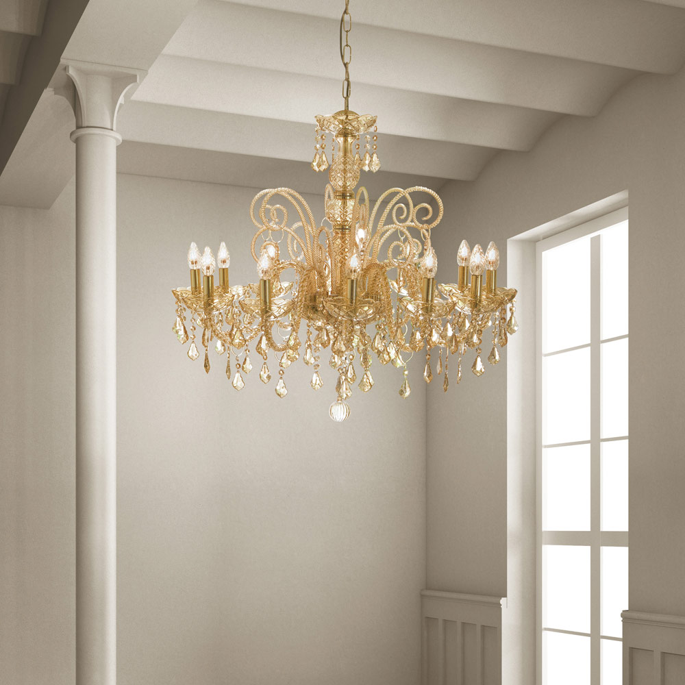 Żyrandol ze szkła weneckiego z dekoracją bursztynową z narodowymi zawieszkami i polerowanym chromowanym metalem . Wykonany z kunsztu , ten dodatek charakteryzuje się wspaniałymi ramionami, które są wykonywane ręcznie techniką skręcania, co tworzy ekskluzywny efekt, który estetycznie przypomina splot liny, nadając żyrandolowi osobowość. Prawdziwy deszcz światła wdziera się w strukturę żyrandola, a następnie rozchodzi się po otoczeniu poprzez załamanie magii cekinów i kryształowych wisiorków z delikatnymi wykończeniami, tworząc w ten sposób sugestywny i zjawiskowy efekt scenograficzny, który jest czarujący i zaskakujący. za elegancję i majestat .
