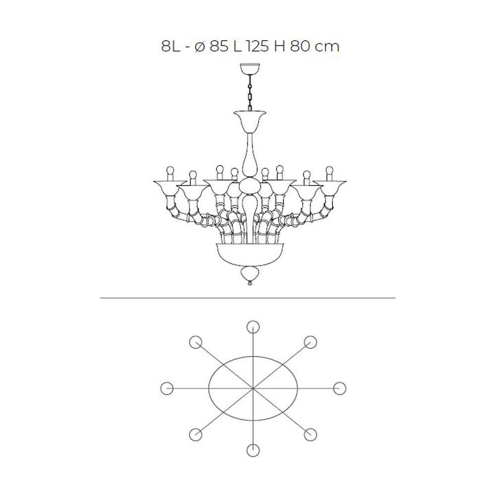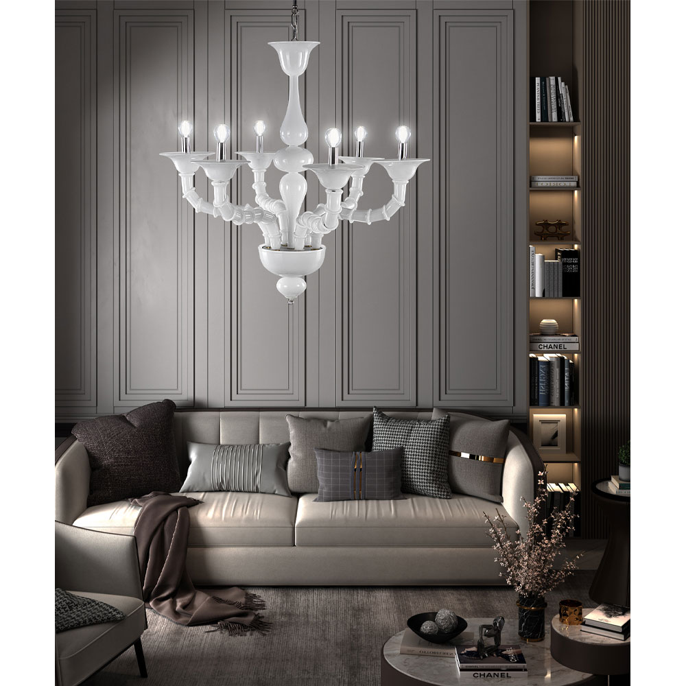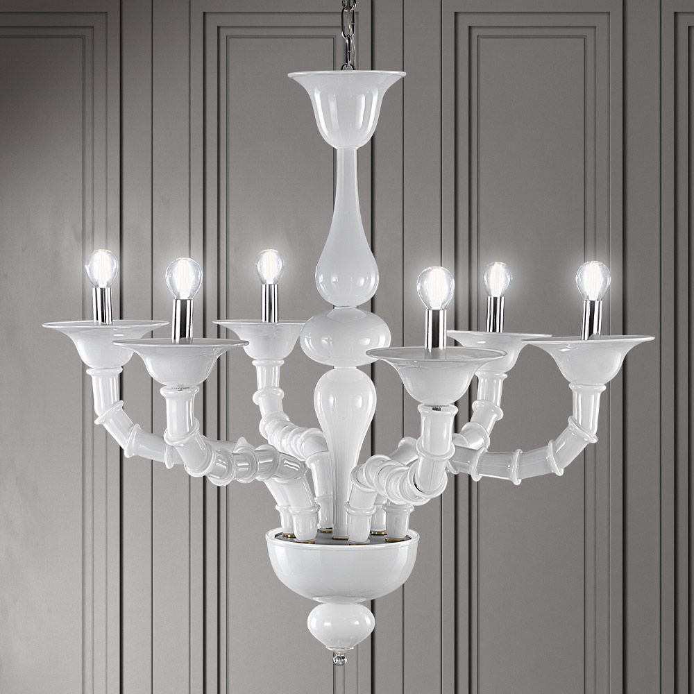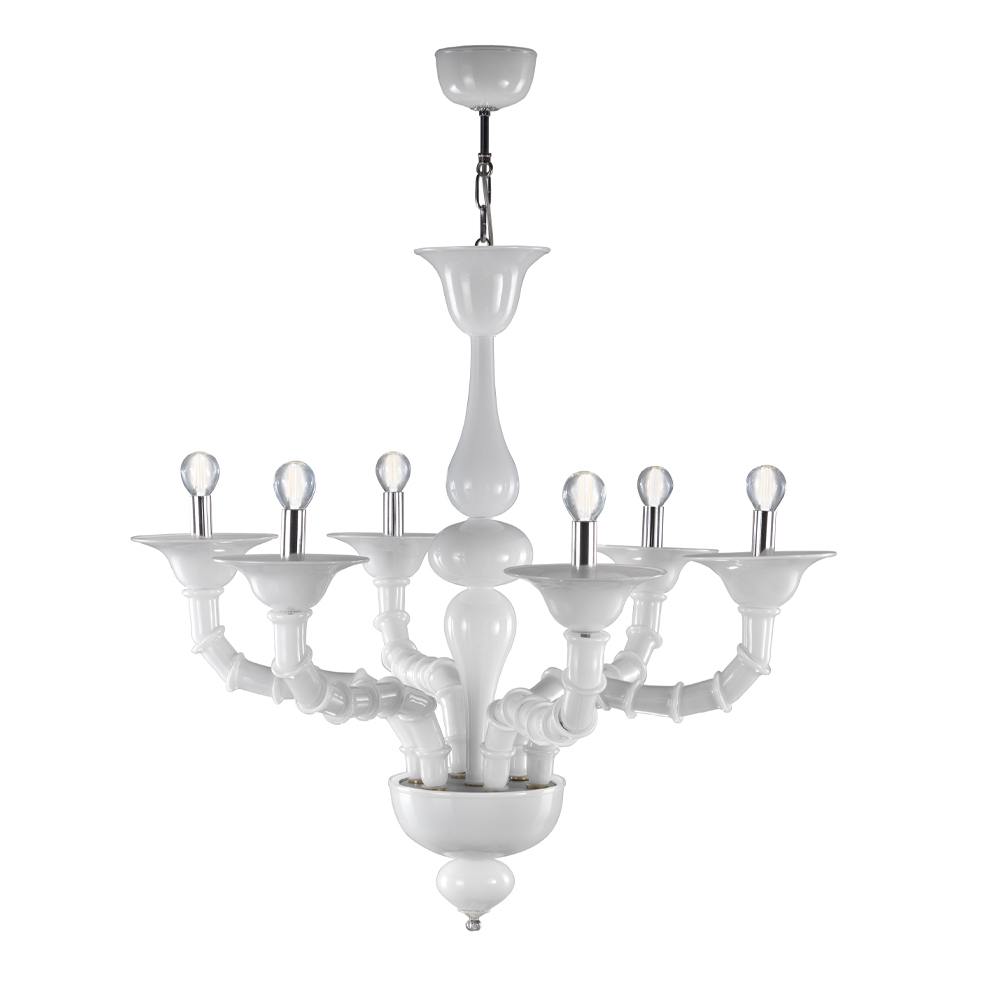 z ręcznie dmuchanego białego szkła Rezzonico, zaprojektowane tak, aby uzupełniać duże powierzchnie domu, takie jak jadalnie czy salony, ożywiając wysokiej jakości oświetlenie o intrygującej osobowości. Długość ramion jest możliwa dzięki szczególnej technice określanej jako „bossole” polegającej na łączeniu ze sobą kilku szklanych części, co jest dowodem