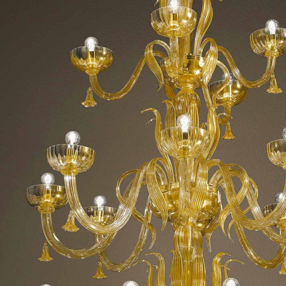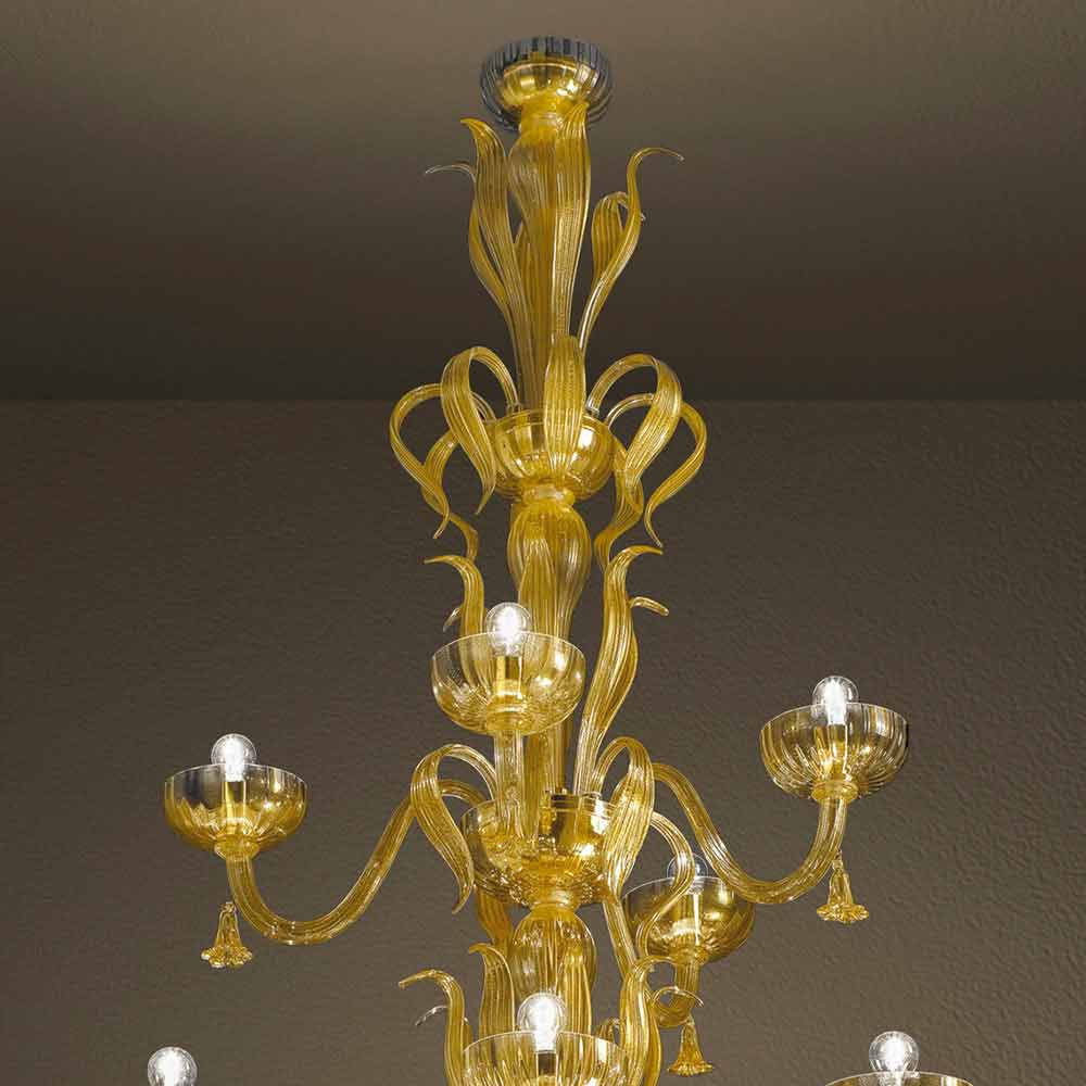 Imponujący i elegancki klasyczny żyrandol wyprodukowany we Włoszech w Wenecji z ręcznie wykonanego szkła pokrytego 24 karatowym złotem nakładanym na gorąco podczas obróbki i detalami z błyszczącego złotego metalu . Ten wspaniały mebel zrodził się z zastosowania prastarej techniki poszycia, której estetyka opiera się na koncepcjach innowacyjności i jednocześnie przywoływania przeszłości . Wraz z majestatem ze złota , wzór wzbogacają zwężające się ramiona ozdobione wisiorkami w całości ukształtowanymi ręcznie, co zapewnia wysoką jakość i nieocenioną wartość .