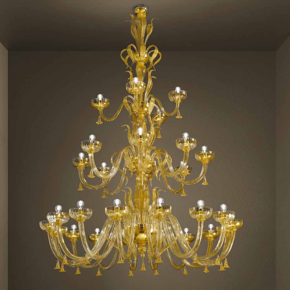 Ręcznie robiony żyrandol z 28 lampkami ze szkła weneckiego i 24-karatowego złota, Made in Italy.