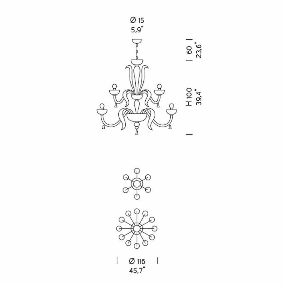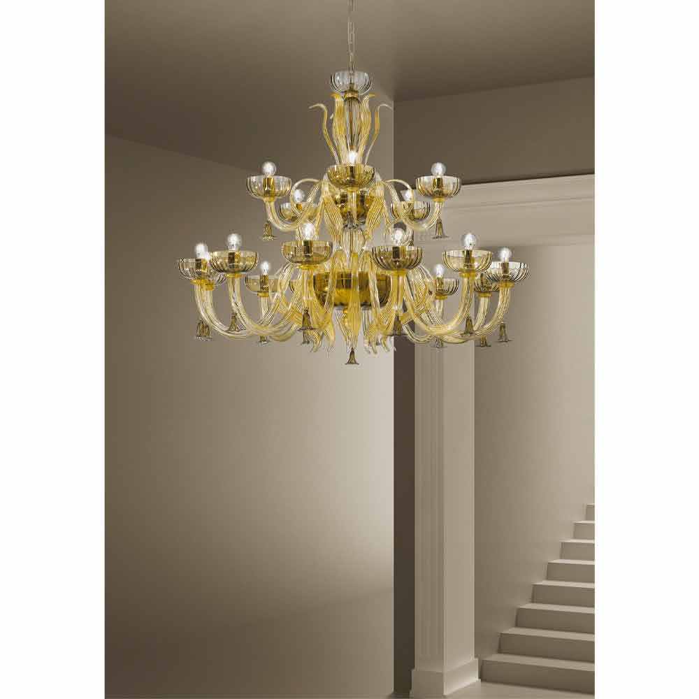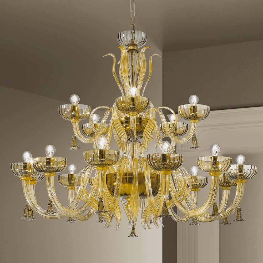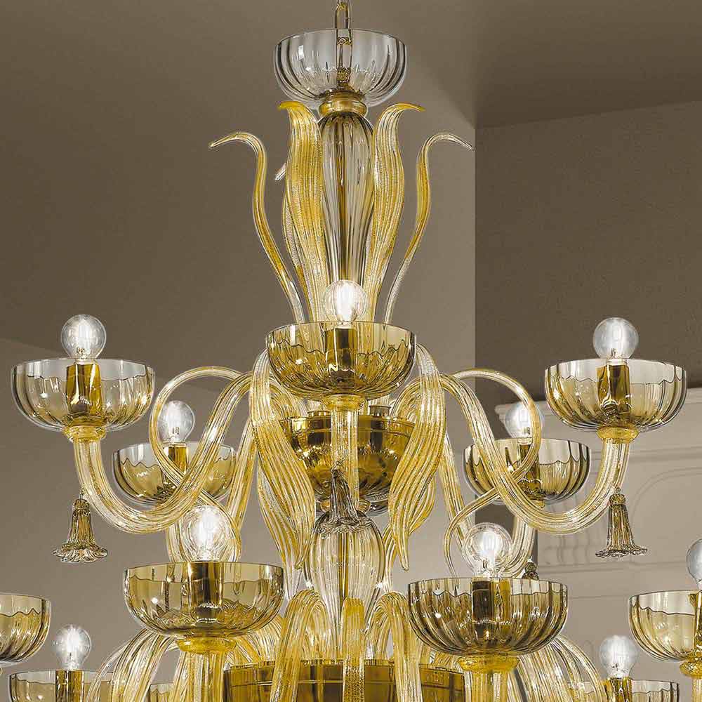 Klasyczny żyrandol wykonany we Włoszech w Wenecji z ręcznie obrobionego przydymionego szkła z elementami z 24 karatowego złota nakładanymi na gorąco podczas obróbki i detalami z błyszczącego złotego metalu . Z obsesyjnej dbałości o szczegóły i ogromnej pasji mistrzów vertrai powstaje rozwiązanie umeblowania o imponującej osobowości, które podbija każdą przestrzeń dzięki swoim dużym wymiarom i wspaniałej kombinacji wybranych wykończeń. Dotyk złota jeszcze bardziej podnosi jego wartość, ożywiając prawdziwe dzieło sztuki .