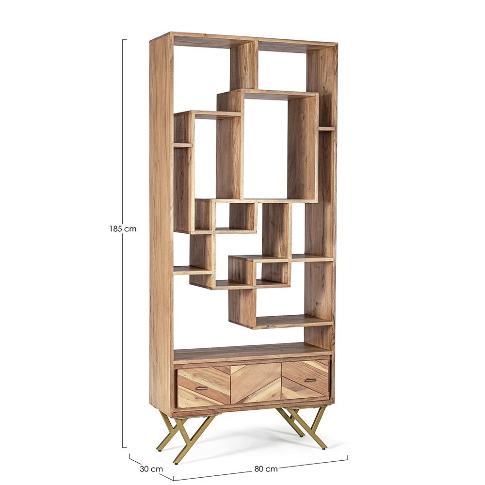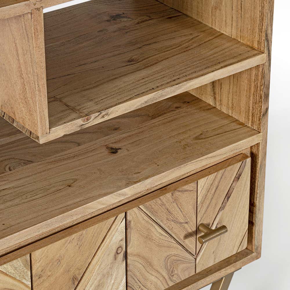 Regał do salonu ma konstrukcję z drewna akacjowego, tył ze sklejki i wnętrze szuflad, wykończenie na bazie lakieru poliuretanowego.