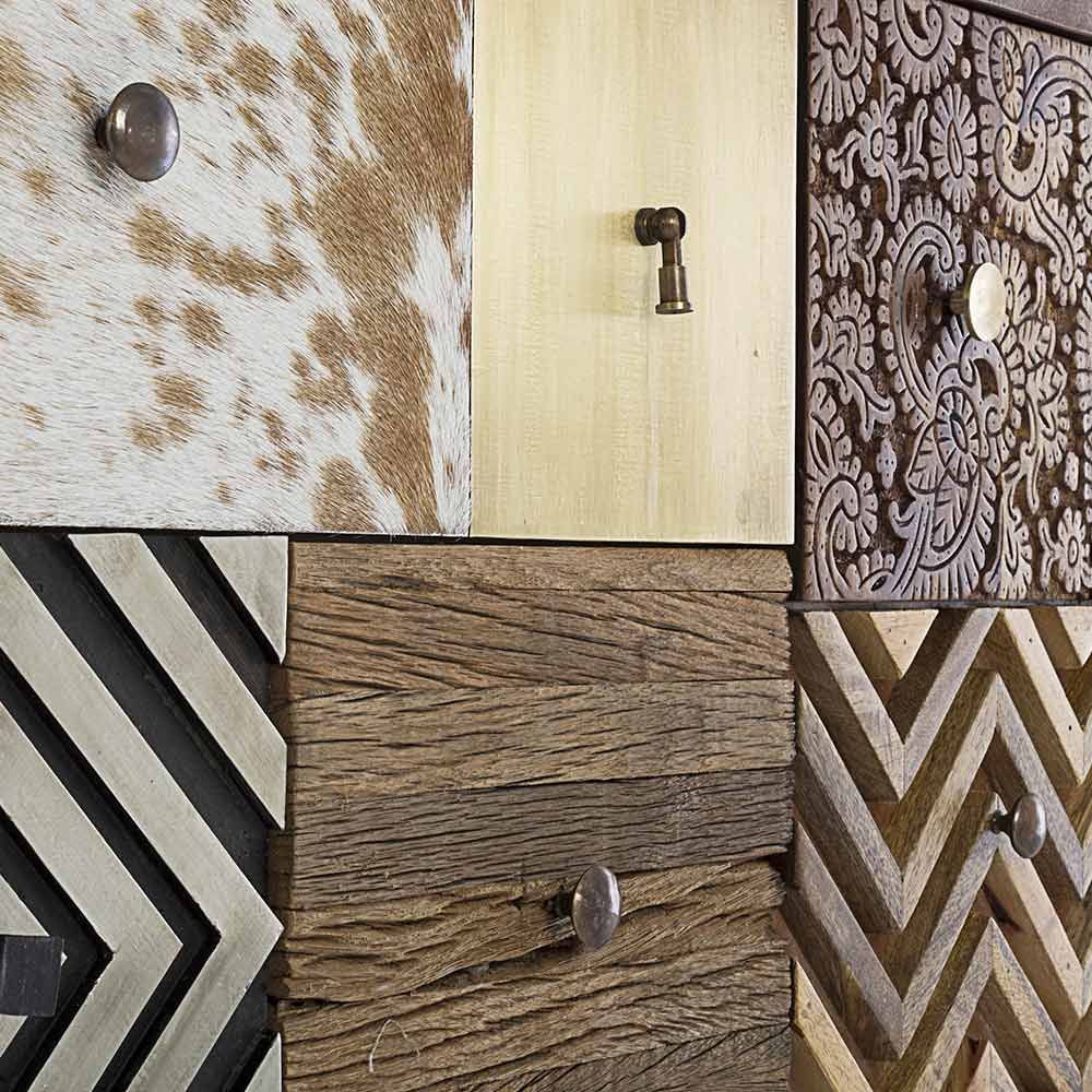 Przód drzwi wykonany jest z pochodzącego z recyklingu drewna mango i akacji, wykończonego farbą na bazie wody.