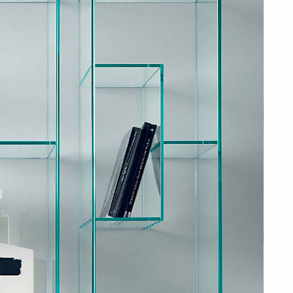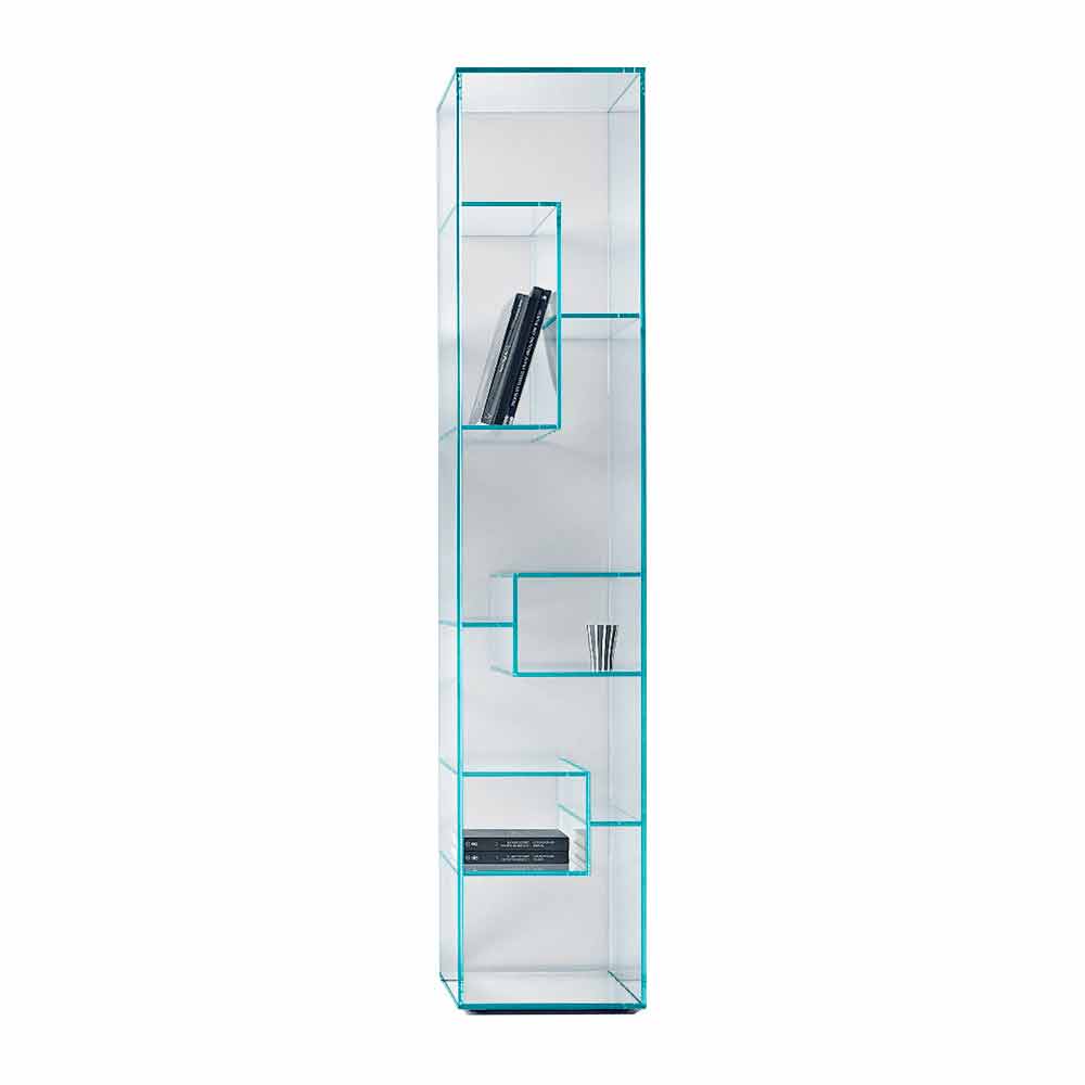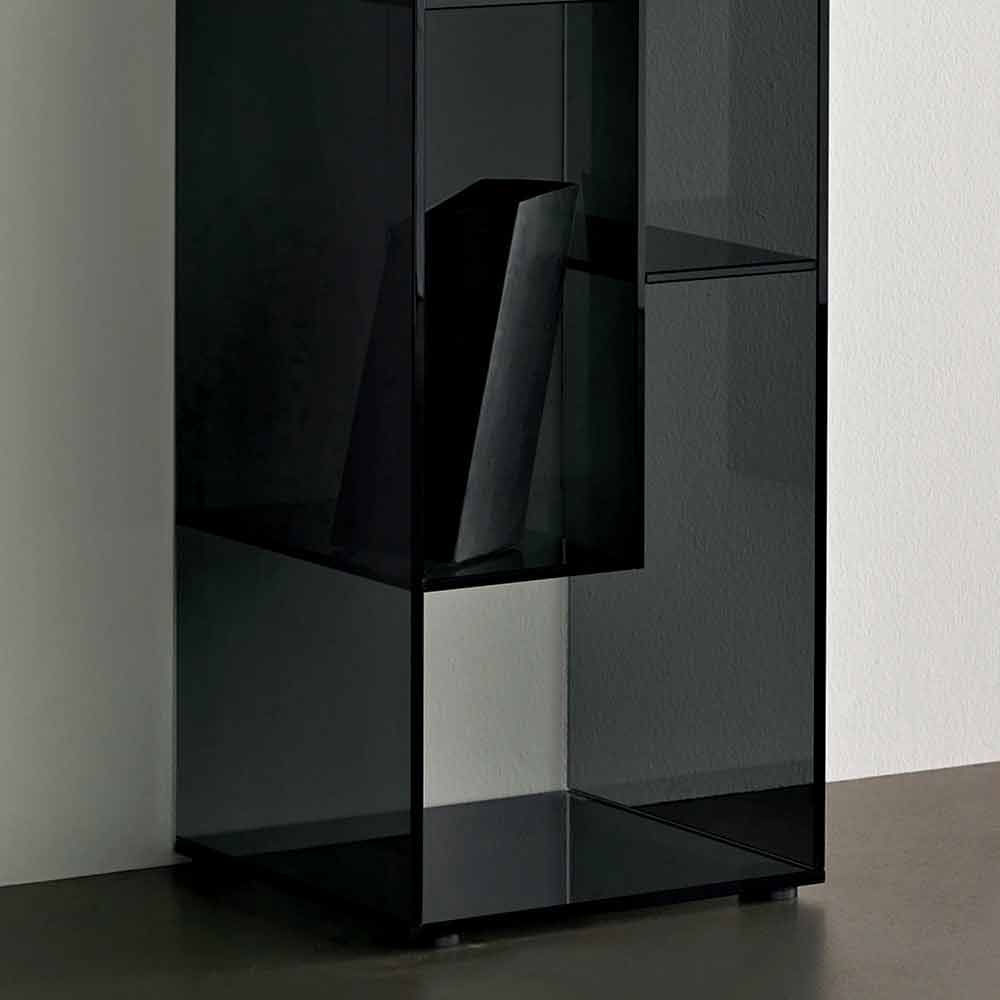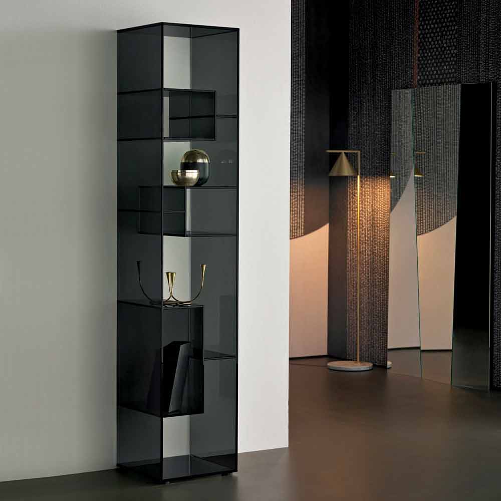 Regał ten charakteryzuje się zdecydowanym i eleganckim designem w całości wykonanym z wyjątkowo przezroczystego lub dymionego szkła.