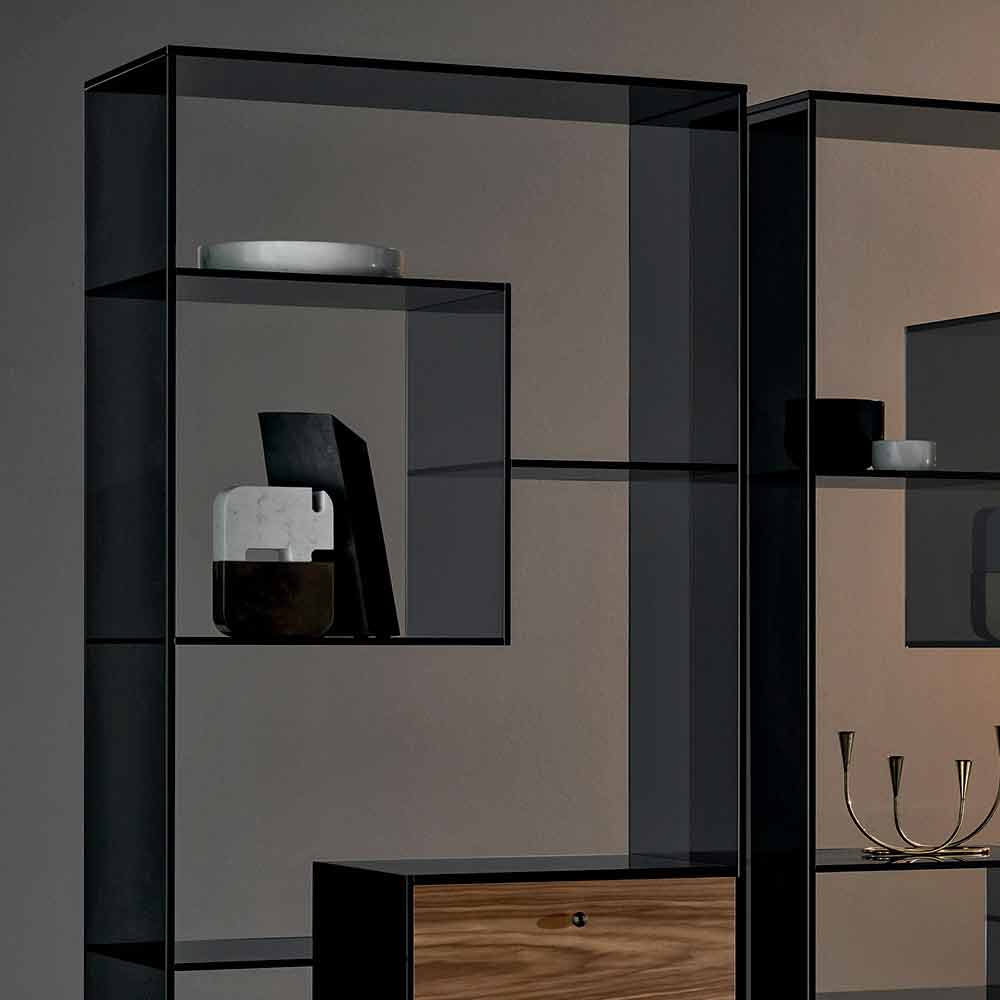 Regał ten charakteryzuje się zdecydowanym i eleganckim designem w całości wykonanym z przydymionego szkła.
