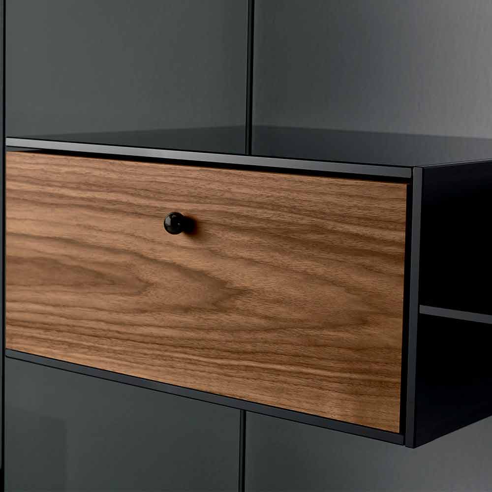 W zestawie szuflada z drewna orzechowego canaletto z pokrętłem z brązowego wykończenia, którą można dowolnie umieścić w dwóch komorach referencyjnych. Dopuszczalne obciążenie każdej półki to 15 kg.