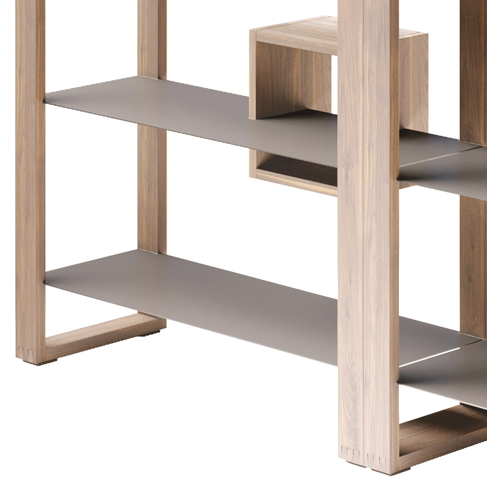 Modułowy i wymienny otwarty regał z drewna orzechowego z półkami z lakierowanego drewna Made in Italy.